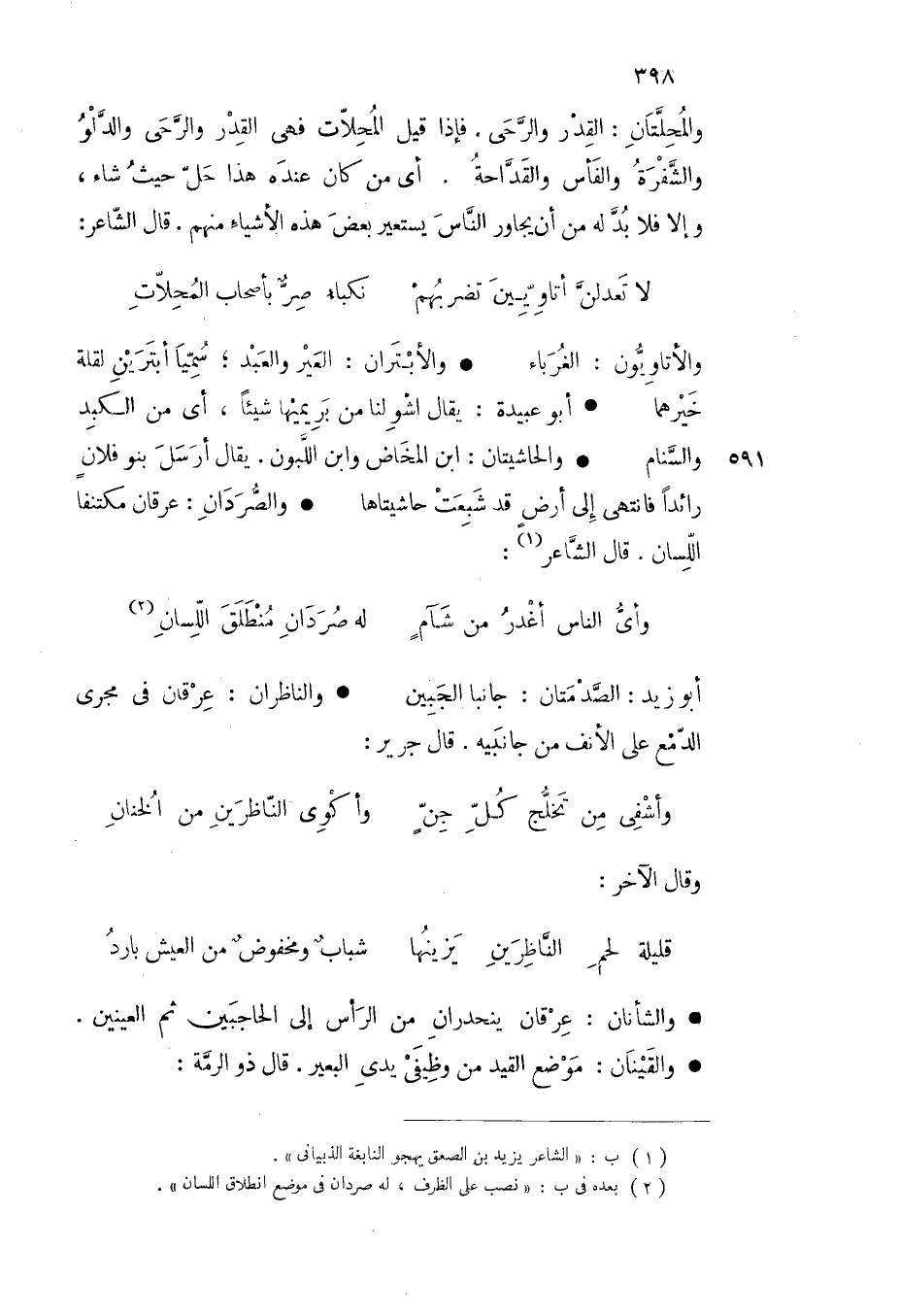 والأتاويون الغرباء والأبتران العير والعبد سميا أبترين لقلة خيرهما أبو عبيدة يقال اشو لنا من بريميها شيئا أي من الكبد والسنام والحاشيتان ابن المخاض وابن اللبون يقال أرسل بنو فلان رائدا فانتهى إلى أرض قد شبعت حاشيتاها والصردان عرقان مكتنفا اللسان قال الشاعر