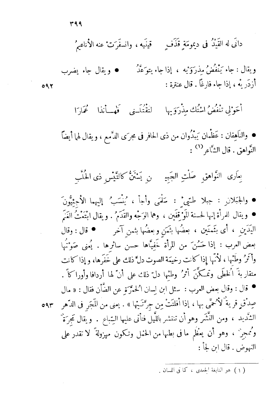 ويقال ابتعت الغنم اليدين أي بثمنين بعضها بثمن وبعضها بثمن آخر قال وقال بعض العرب إذا حسن من المرأة خفياها حسن سائرها يعني صوتها وأثر وطئها لأنها إذا كانت رخيمة الصوت دل ذلك على خفرها وإذا كانت متقاربة الخطى وتمكن أثر وطئها دل ذلك على أن لها أردافا وأوراكا قال وقال بعض العرب سئل ابن لسان الحمرة عن الضأن فقال مال صدق قرية لاحمى بها إذا أفلتت من جرتيها يعني من المجر في الدهر الشديد ومن النشر وهو أن تنتشر بالليل فتأتي عليها السباع