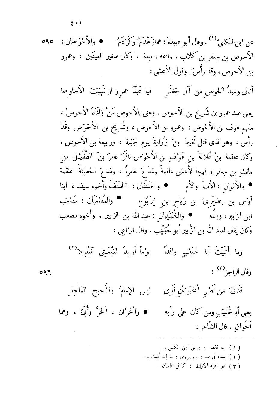 يعني عبد عمرو بن شريح بن الأحوص وعنى بالأحوص من ولده الأحوص منهم عوف بن الأحوص وعمرو بن الأحوص وشريح بن الأحوص وقد رأس وهو الذي قتل لقيط بن زرارة يوم جبلة وربيعة بن الأحوص وكان علقمة بن علاثة بن عوف بن الأحوص نافر عامر بن الطفيل بن مالك بن جعفر فهجا الأعشى علقمة ومدح عامرا ومدح الحطيئة علقمة والأبوان الأب والأم والحنتفان الحنتف وأخوه سيف ابنا أوس بن حميري بن رياح بن يربوع والمصعبان مصعب بن الزبير وابنه والخبيبان عبد الله بن الزبير وأخوه مصعب وكان يقال لعبد الله بن الزبير أبو خبيب وقال الراعي
