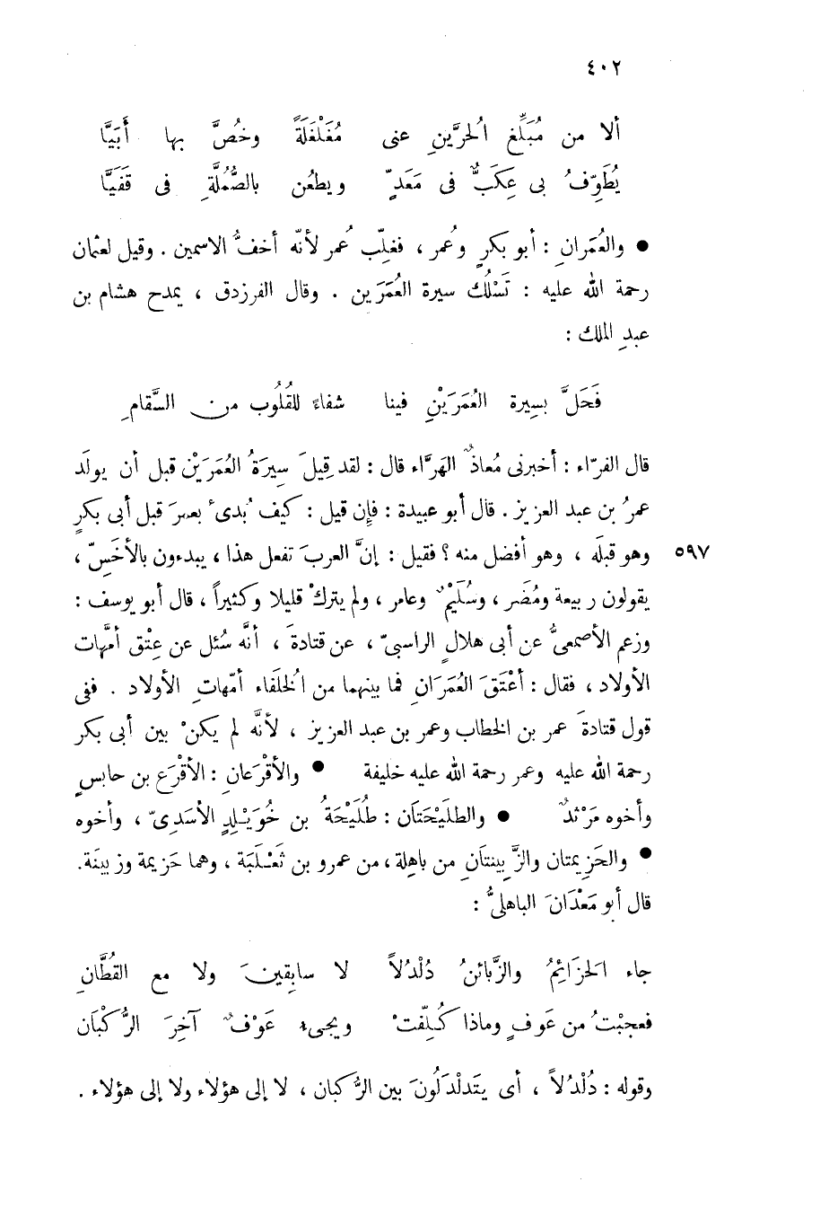 قال الفراء أخبرني معاذ الهراء قال لقد قيل سيرة العمرين قبل أن يولد عمر بن عبد العزيز قال أبو عبيدة فإن قيل كيف بدئ بعمر قبل أبي بكر وهو قبله وهو أفضل منه فقيل إن العرب تفعل هذا يبدءون بالأخس يقولون ربيعة ومضر وسليم وعامر ولم يترك قليلا وكثيرا قال أبو يوسف وزعم الأصمعي عن أبي هلال الراسبي عن قتادة أنه سئل عن عتق أمهات الأولاد فقال أعتق العمران فما بينهما من الخلفاء أمهات الأولاد ففي قول قتادة عمر بن الخطاب وعمر بن عبد العزيز لأنه لم يكن بين أبي بكر رحمة الله عليه وعمر رحمة الله عليه خليفة والأقرعان الأقرع بن حابس وأخوه مرثد والطليحتان طليحة بن خويلد الأسدي وأخوه والحزيمتان والزبينتان من باهلة من عمرو بن ثعلبة وهما حزيمة وزبينة قال أبو معدان الباهلي
