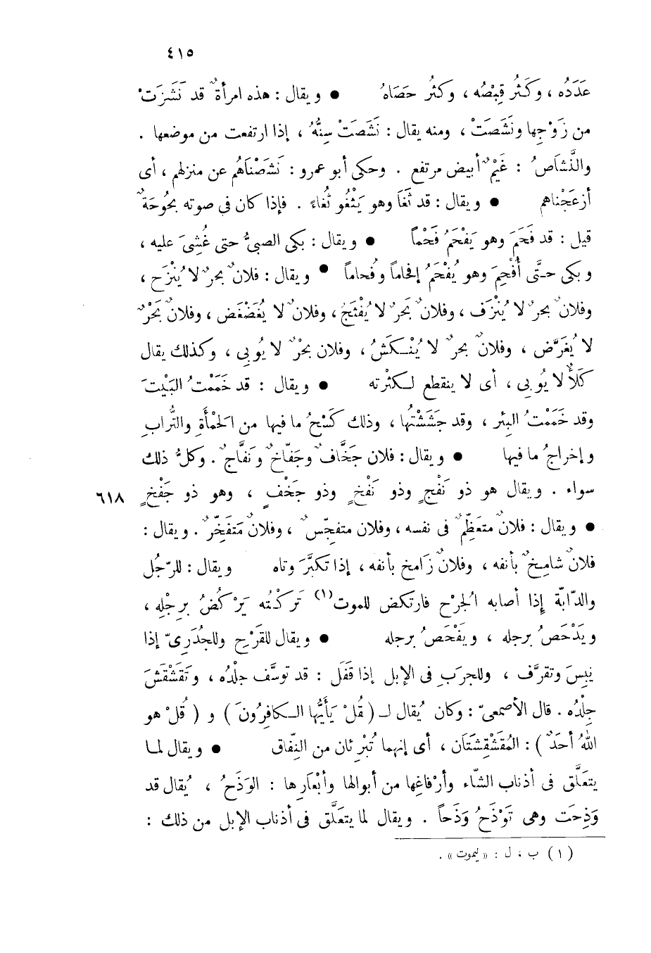 ويقال فلان بحر لا ينزح وفلان بحر لا ينزف وفلان بحر لا يفثج وفلان لا يغضغض وفلان بحر لا يغرض وفلان بحر لا ينكش وفلان بحر لا يوبي وكذلك يقال كلأ لا يوبي أي لا ينقطع لكثرته