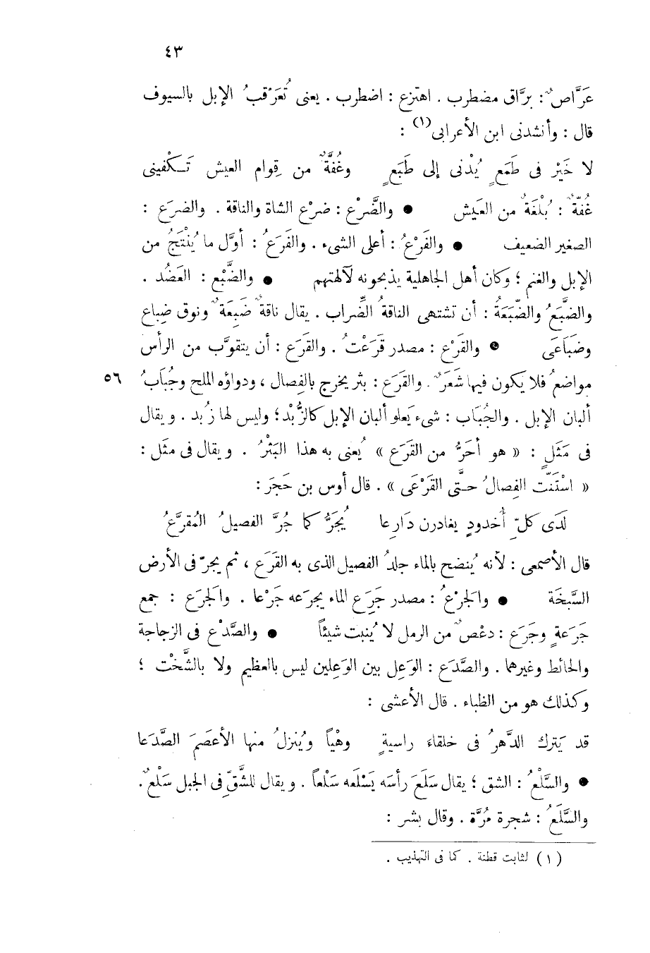 غفة بلغة من العيش والضرع ضرع الشاة والناقة والضرع الصغير الضعيف والفرع أعلى الشيء والفرع أول ما ينتج من الإبل والغنم وكان أهل الجاهلية يذبحونه لآلهتهم والضبع العضد والضبع والضبعة أن تشتهي الناقة الضراب يقال ناقة ضبعة ونوق ضباع وضباعى والقرع مصدر قرعت والقرع أن يتقوب من الرأس مواضع فلا يكون فيها شعر والقرع بثر يخرج بالفصال ودواؤه الملح وجباب ألبان الإبل والجباب شيء يعلو ألبان الإبل كالزبد ولس لها زبد