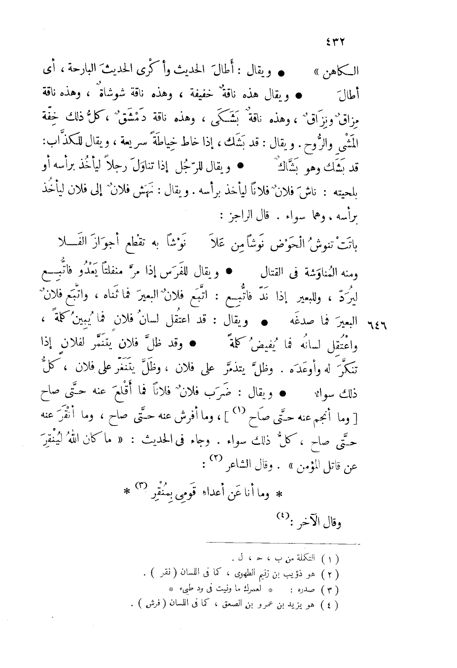 ويقال قد اعتقل لسان فلان فما يبين كلمة واعتقل لسانه فما يفيص كلمة وقد ظل فلان يتنمر لفلان إذا تنكر له وأوعده وظل يتذمر على فلان وظل يتنغر على فلان كل ذلك سواء