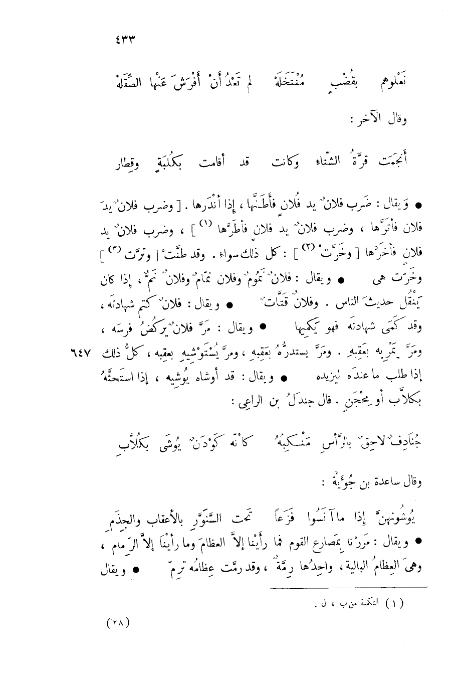 ويقال ضرب فلان يد فلان فأطنها إذا أندرها وضرب فلان يد فلان فأترها وضرب فلان يد فلان فأطرها وضرب فلان يد فلان فأخرها وخرت كل ذلك سواء وقد طنت وترت وخرت هي