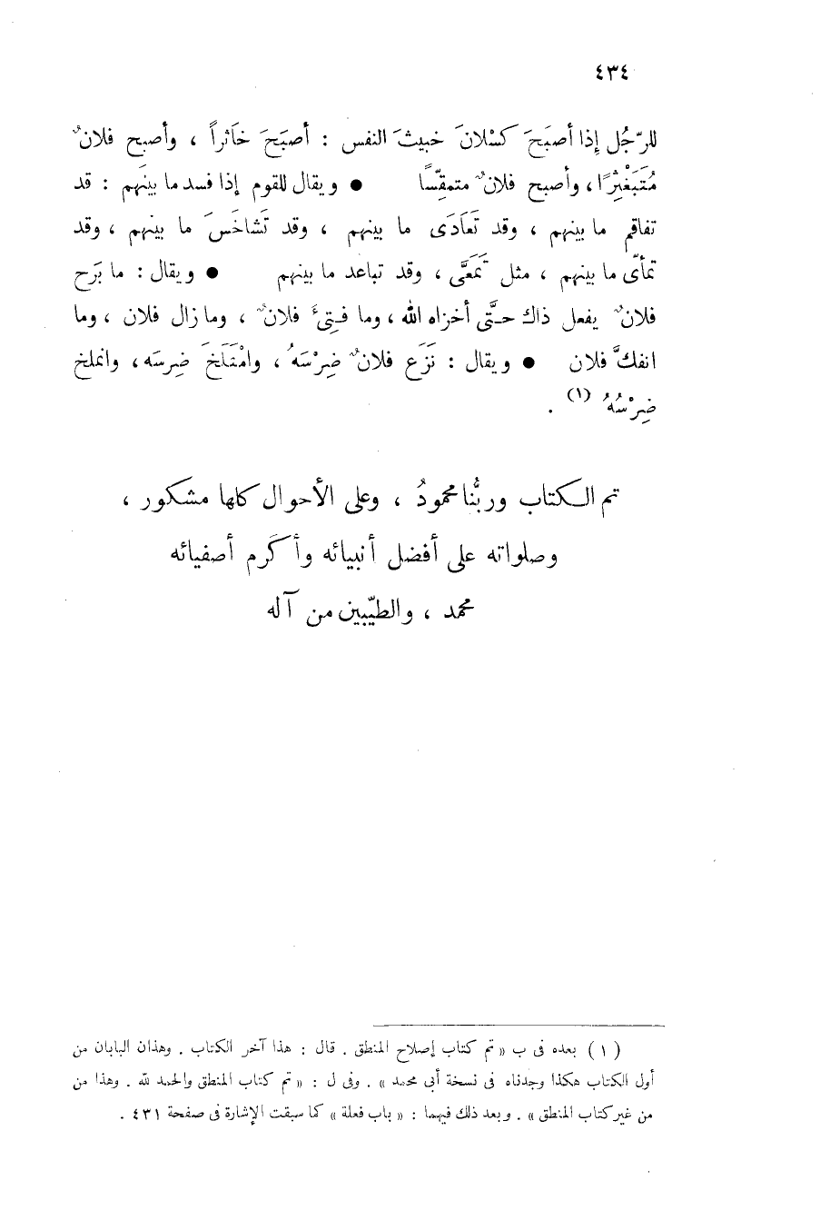 تم الكتاب وربنا محمود وعلى الأحوال كلها مشكور وصلواته على أفضل أنبيائه وأكرم أصفيائه محمد والطيبين من آله