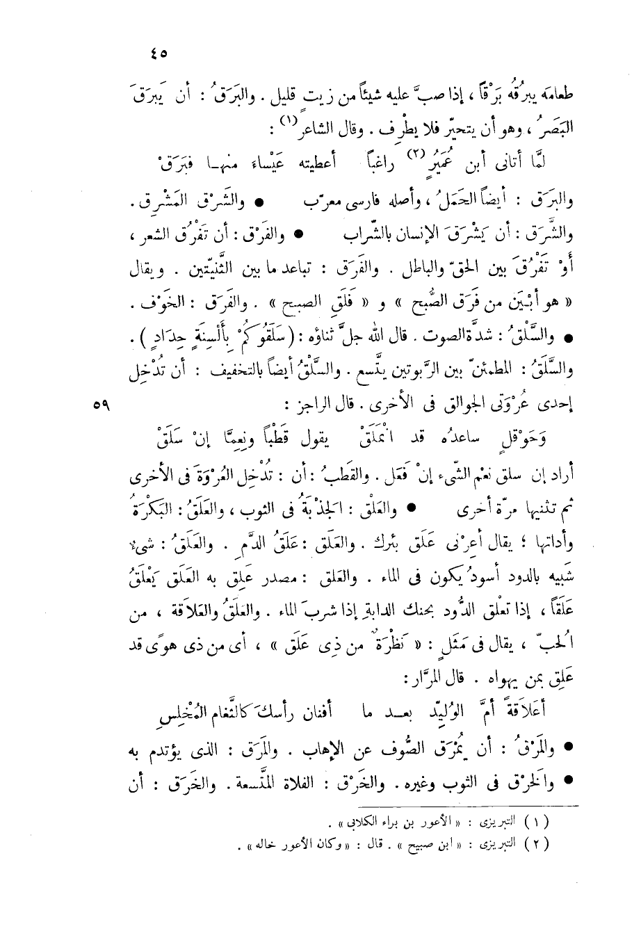 ( أعلاقة أم الوليد بعد ما ... أفنان رأسك كالثغام المخلس ) والمرق أن يمرق الصوف عن الإهاب والمرق الذي يؤتدم به