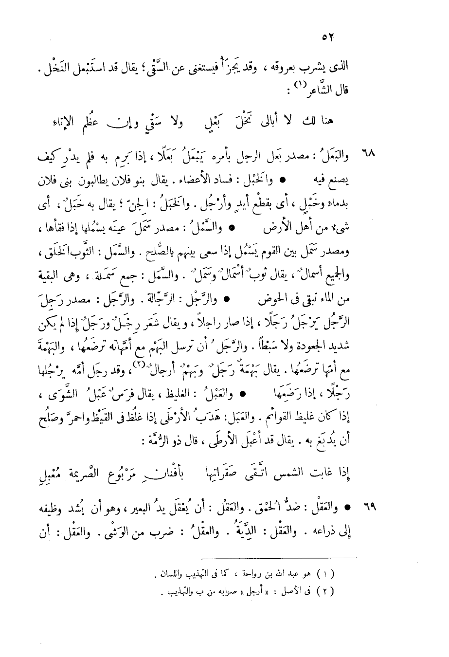 والبعل مصدر بعل الرجل بأمره يبعل بعلا إذا برم به فلم يدر كيف يصنع فيه والخبل فساد الأعضاء يقال بنو فلان يطالبون بني فلان بدماء وخبل أي بقطع أيد وأرجل والخبل الجن يقال به خبل أي شيء من أهل الأرض والسمل مصدر سمل عينه يسملها إذا فقأها ومصدر سمل بين القوم يسمل إذا سعى بينهم بالصلح والسمل الثوب الخلق والجمع أسمال يقال ثوب أسمال وسمل والسمل جمع سملة وهي البقية من الماء تبقى في الحوض والرجل الرجالة والرجل مصدر رجل الرجل يرجل رجلا إذا صار راجلا