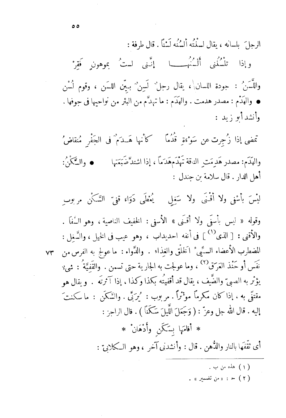 واللسن جودة اللسان يقال رجل لسن بين اللسن وقوم لسن والهدم مصدر هدمت والهدم ما تهدم من البئر من نواحيها في جوفها وأنشد أبو زيد