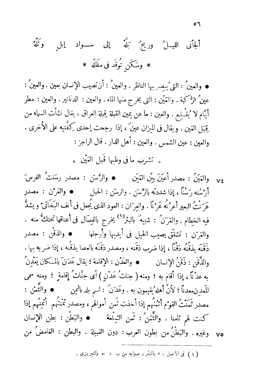 والعين مصدر أعين بين العين والرسن مصدر رسنت الفرس أرسنه رسنا إذا شددته بالرسن والرسن الحبل والعرن مصدر عرنت البعير أعرنه عرنا والعران العود الذي يجعل في أنف البخاتي ويشد فيه الخطام والعرن شبيه بالبثر يخرج بالفصال في أعناقها تحتك منه والعرن تشقق يصيب الخيل في أيديها وأرجلها والذقن مصدر ذقنه يذقنه ذقنا إذا ضرب ذقنه ومصدر ذقنه بالعصا يذقنه إذا ضربه بها والذقن ذقن الإنسان والعدن الإقامة يقال عدن بالمكان يعدن به عدنا إذا أقام به ومنه ( جنات عدن ) أي جنات إقامة ومنه سمى المعدن معدنا لأن أهله يقيمون به وعدن اسم بلد باليمن والثمن مصدر ثمنت القوم أثمنهم إذا أخذت ثمن أموالهم ومصدر ثمنتهم أثمنهم إذا كنت لهم ثامنا والثمن ثمن السلعة والبطن بطن الإنسان وغيره والبطن من بطون العرب دون القبيلة والبطن الغامض من