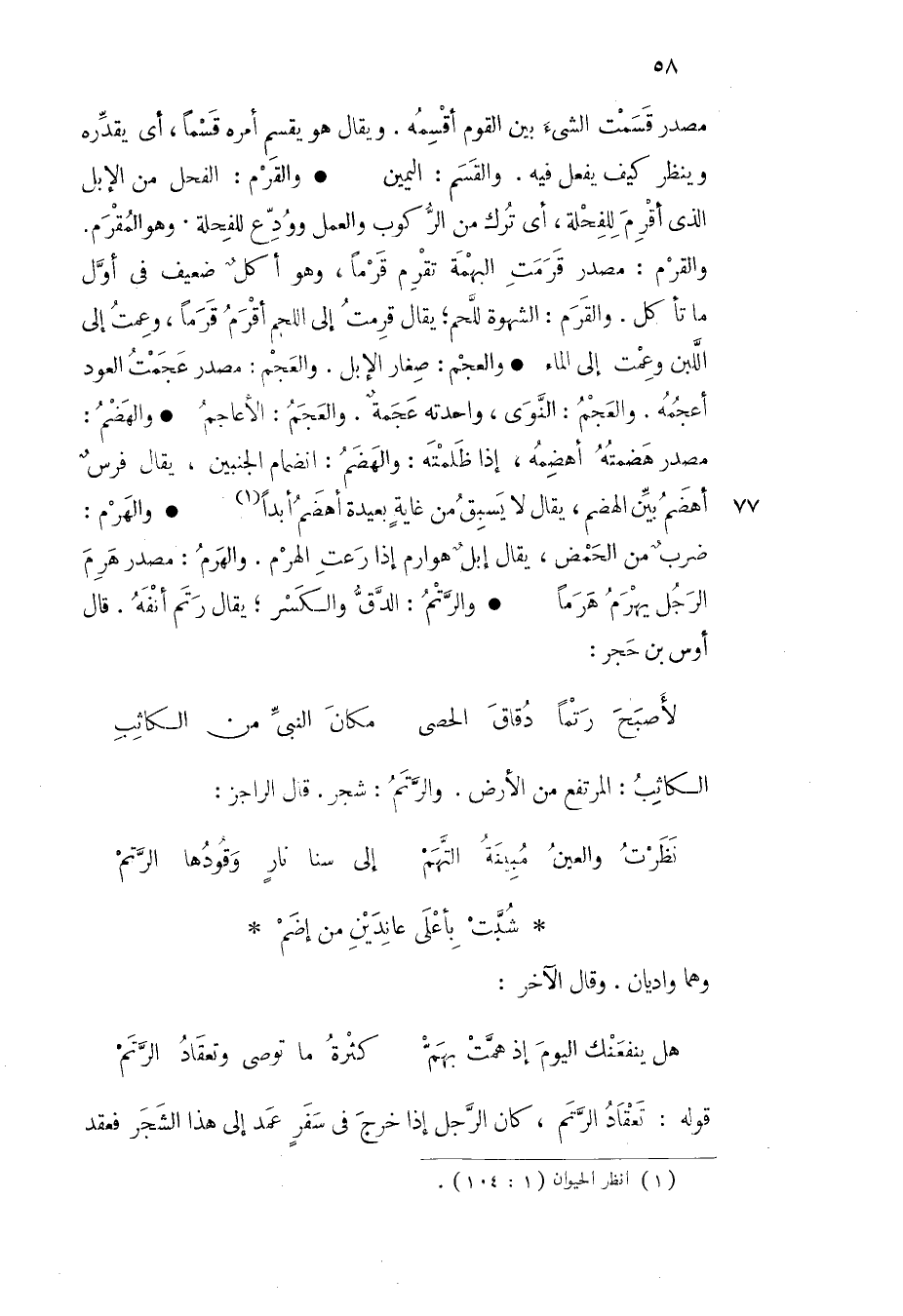 والفرم الفحل من الإبل الذي أقرم للفحلة أي ترك من الركوب والعمل وودع للفحلة وهو المقرم والقرم مصدر قرمت البهمة تقرم قرما وهو أكل ضعيف في أول ما تأكل والقرم الشهوة للحم يقال قرمت إلى اللحم أقرم قرما وعمت إلى اللبن وعمت إلى الماء والعجم صغار الإبل والعجم مصدر عجمت العود أعجمه والعجم النوى واحدته عجمة والعجم الأعاجم والهضم مصدر هضمته أهضمه إذا ظلمته والهضم انضمام الجنبين يقال فرس أهضم بين الهضم يقال لا يسبق من غاية بعيدة أهضم أبدا والهرم ضرب من الحمض يقال إبل هوارم إذا رعت الهرم والهرم مصدر هرم الرجل يهرم هرما والرتم الدق والكسر يقال رتم أنفه قال أوس بن حجر
