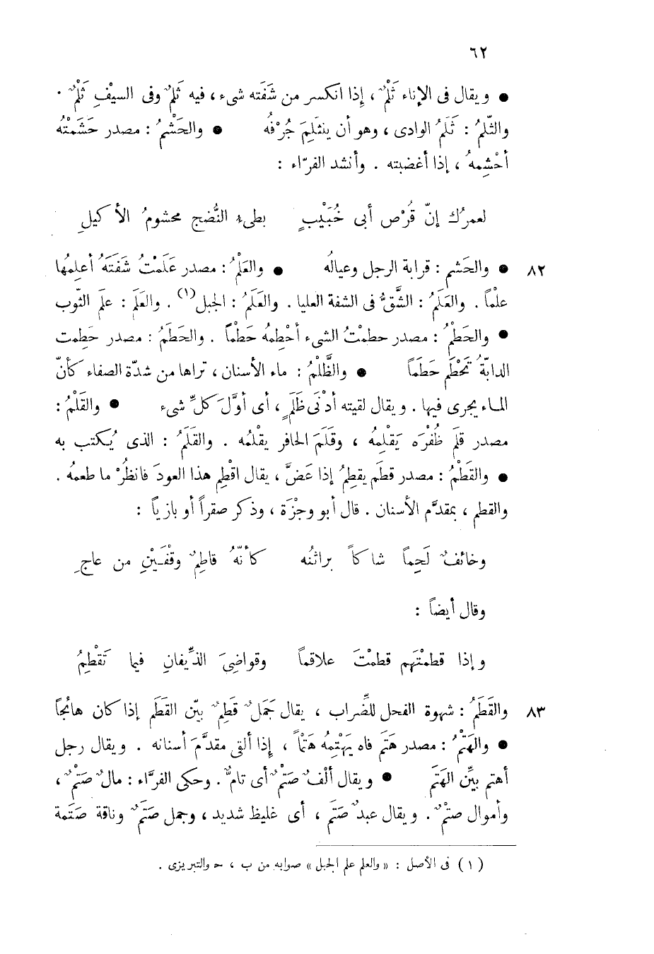 والحشم قرابة الرجل وعياله والعلم مصدر علمت شفته أعلمها علما والعلم الشق في الشفة العليا والعلم الجبل والعلم علم الثوب