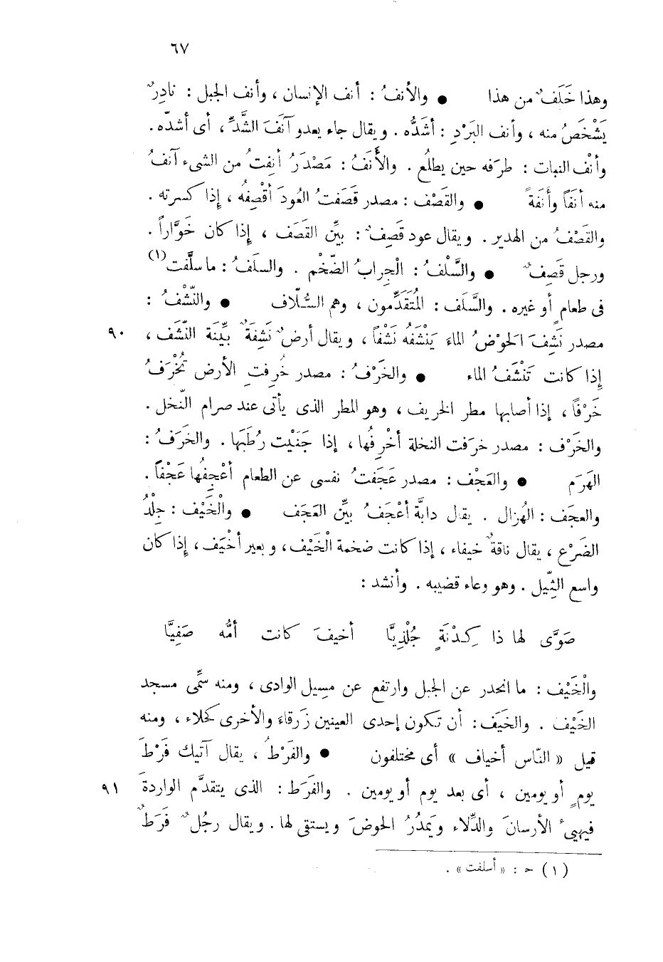 ويقال عود قصف بين القصف إذا كان خوارا ورجل قصف والسلف الجراب الضخم والسلف ما سلفت في طعام أو غيره والسلف المتقدمون وهم السلاف والنشف مصدر نشف الحوض الماء ينشفه نشفا