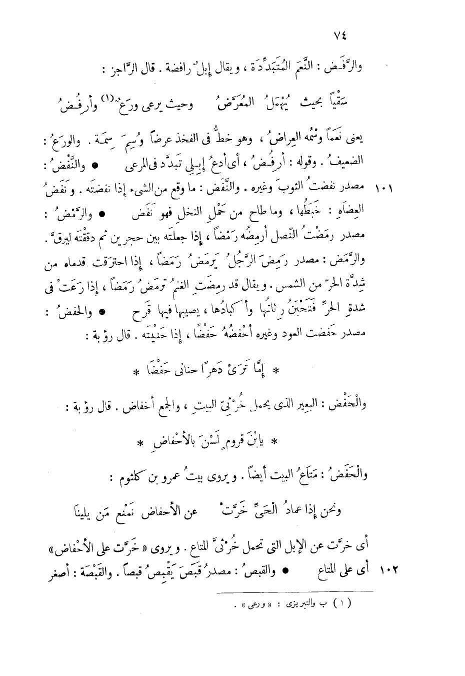 يعني نعما وسمه العراض وهو خط في الفخد عرضا وسم سمة والورع الضعيف وقوله أرفض أي أدع إبلى تبدد في المرعى والنفض مصدر نفضت الثوب وغيره والنفض ما وقع من الشيء إذا نفضته ونفض العضاه خبطها وما طاح من حمل النخل فهو نفض والرمض مصدر رمضت النصل أرمضه رمضا إذا جعلته بين حجرين ثم دققته ليرق والرمض مصدر رمض الرجل يرمض رمضا إذا احترقت قدماه من شدة الحر من الشمس