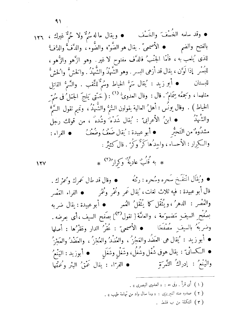 ويقال ما له سم ولا حم غيرك بالفتح والضم الأصمعي يقال هو الضوء والضوء والدف والدف للذي يلعب به فأما الجنب فالدف مفتوح لا غير وهو الزهو والزهو للبسر إذا لون يقال قد أزهى البسر وهو الشهد والشهد والحش والحش للبستان أبو زيد يقال سم الخياط وسم للثقب والسم القاتل مثلهما وجمعه سمام قال وقال العدوي ( حتى يلج الجمل في سم الخياط ) وقال يونس أهل العالية يقولون السم والشهد وتميم تقول السم والشهد ابن الأعرابي يقال شده وشده من قولك رجل مشدوه من التحير أبو عبيدة يقال ضعف وضعف الفراء والكرار الأحساء واحدها كر وكر قال كثير