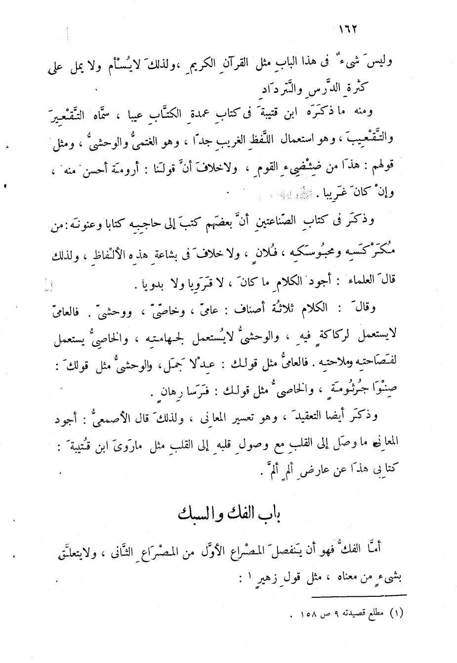 من غيره لأنه قل في أشعارهم، وقالوا: إنه بمنزلة اللثغة تستحسن، فإذا كثرت صارت خرساً؛ والشية تستحسن في الفرس، فإذا كثرت صارت بلقا، والجعودة تستحسن في الشعر، فإذا كثرت صارت قططا. وقالوا: خير الأمور أوسطهإن والحسنة بين الشيئين، والفضيلة بين الرذيلتين.