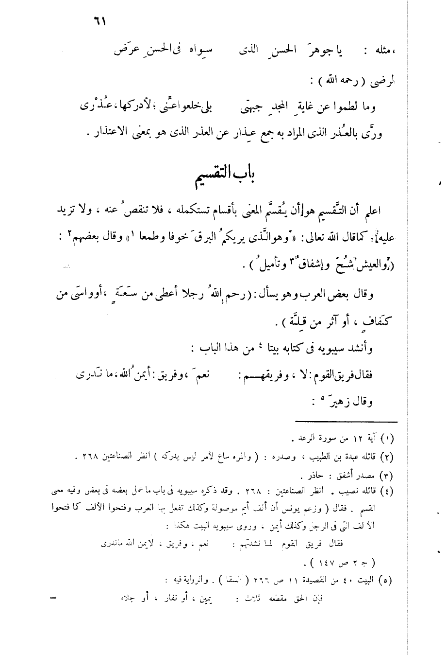 اعلم أن التجزئة هو أن يكون البيت مجزأ ثلاثة أجزاء أو أربعة، كما قال المتنبي: