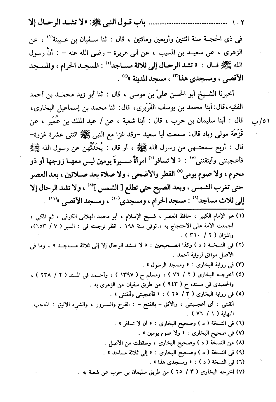 في ذي الحجة سنة اثنتين وأربعين ومائتين، قال: ثنا سفيان بن عيينة، عن الزهري، عن سعيد بن المسيب، عن أبي هريرة -رضي الله عنه-: أن رسول الله صلى الله عليه وسلم قال: ((تشد الرحال إلى ثلاثة مساجد: المسجد الحرام، والمسجد الأقصى، ومسجدي هذا، مسجد المدينة)).