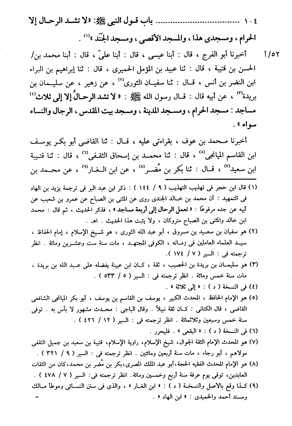 أخبرنا أبو الفرج، قال: أبنا عيسى، قال: أبنا علي، قال: أبنا محمد بن الحسن بن قتيبة، قال: ثنا عبيد بن المؤمل الحميري، قال: ثنا إبراهيم بن البراء ابن النضر بن أنس، قال: ثنا سفيان الثوري، عن زهير، عن سليمان بن بريدة، عن أبيه قال: قال رسول الله صلى الله عليه وسلم: ((لا تشد الرحال إلا إلى ثلاث مساجد: مسجد الحرام، ومسجد المدينة، ومسجد بيت المقدس، الرجال والنساء سواء)).