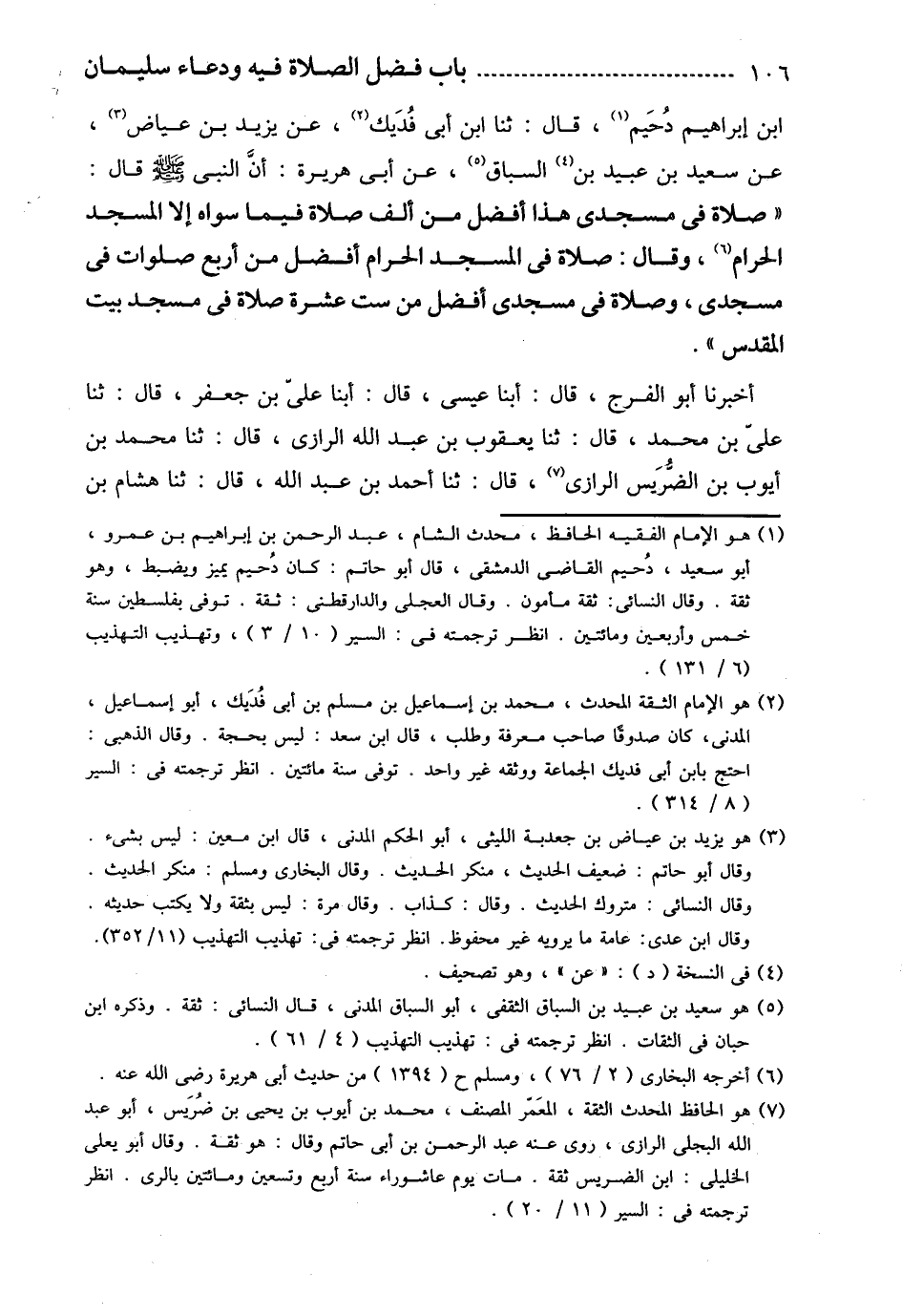 ابن إبراهيم دحيم، قال: ثنا ابن أبي فديك، عن يزيد بن عياض، عن سعيد بن عبيد بن السباق، عن أبي هريرة، أن النبي صلى الله عليه وسلم قال: ((صلاة في مسجدي هذا أفضل من ألف صلاة فيما سواه إلا المسجد الحرام، وقال: صلاة في المسجد الحرام أفضل من أربع صلوات في مسجدي، وصلاة في مسجدي أفضل من ست عشرة صلاة في مسجد بيت المقدس)).