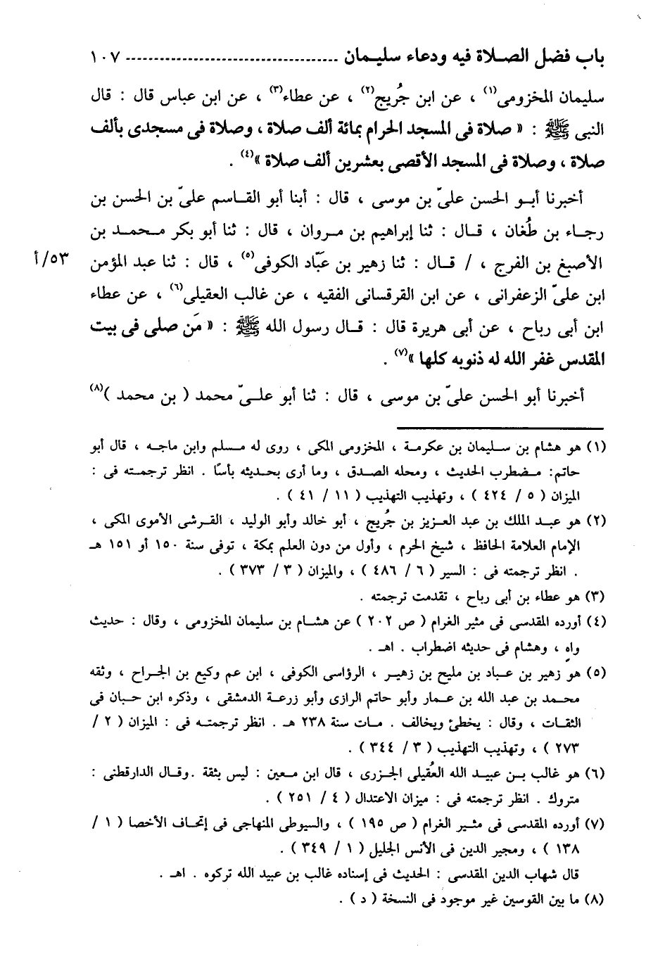 أخبرنا أبو الحسن علي بن موسى، قال: أبنا أبو القاسم علي بن الحسن بن رجاء بن طغان، قال: ثنا إبراهيم بن مروان، قال: ثنا أبو بكر محمد بن الأصبغ بن الفرج، قال: ثنا زهير بن عباد الكوفي، قال: ثنا عبد المؤمن ابن علي الزعفراني، عن ابن القرقساني الفقيه، عن غالب العقيلي، عن عطاء ابن أبي رباح، عن أبي هريرة قال: قال رسول الله صلى الله عليه وسلم: ((من صلى في بيت المقدس غفر الله له ذنوبه كلها)).