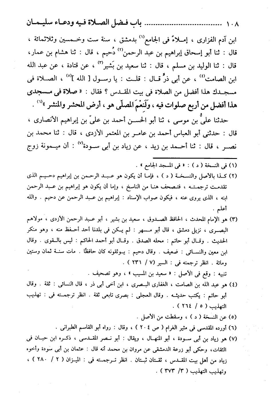ابن آدم الفزاري، إملاءً في الجامع بدمشق، سنة ست وخمسين وثلاثمائة، قال: ثنا أبو إسحاق إبراهيم بن عبد الرحمن دحيم، قال: ثنا هشام بن عمار، قال: ثنا الوليد بن مسلم، قال: ثنا سعيد بن بشير، عن قتادة، عن عبد الله ابن الصامت، عن أبي ذر قال: قلت: يا رسول [الله]، الصلاة في مسجدك هذا أفضل من الصلاة في بيت المقدس؟ فقال: ((صلاة في مسجدي هذا أفضل من أربع صلوات فيه، ولنعم المصلى هو، أرض المحشر والمنشر)).