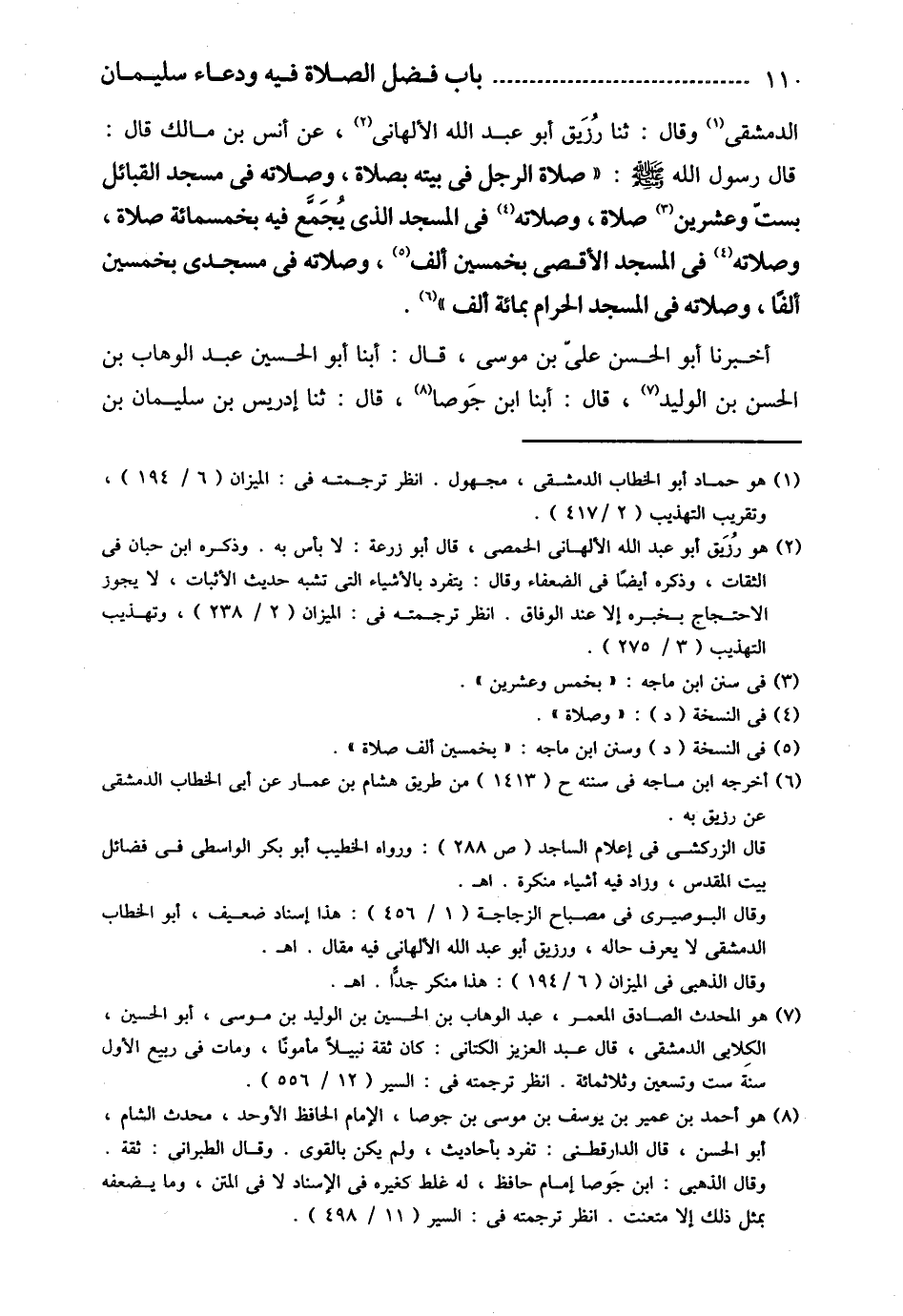 الدمشقي وقال: ثنا رزيق أبو عبد الله الألهاني، عن أنس بن مالك قال: قال رسول الله صلى الله عليه وسلم: ((صلاة الرجل في بيته بصلاة، وصلاته في مسجد القبائل بست وعشرين صلاة، وصلاته في المسجد الذي يجمع فيه بخمسمائة صلاة، وصلاته في المسجد الأقصى بخمسين ألف، وصلاته في مسجدي بخمسين ألفًا، وصلاته في المسجد الحرام بمائة ألف)).