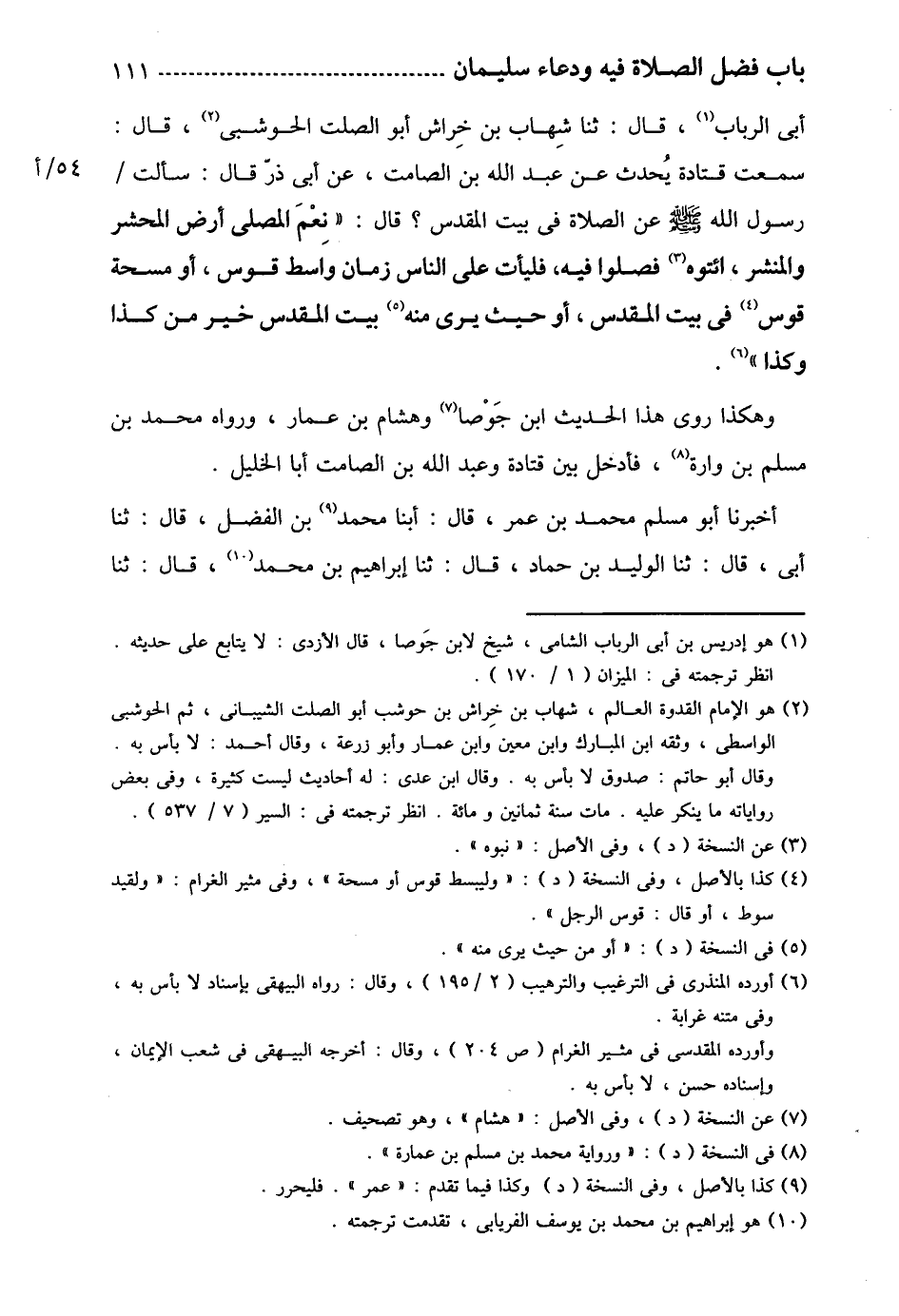أبي الرباب، قال: ثنا شهاب بن خراش أبو الصلت الحوشبي، قال: سمعت قتادة يحدث عن عبد الله بن الصامت، عن أبي ذر قال: سألت رسول الله صلى الله عليه وسلم عن الصلاة في بيت المقدس؟ قال: ((نعم المصلى أرض المحشر والمنشر، ائتوه فصلوا فيه، فليأت على الناس زمان واسط قوس، أو مسحة قوس في بيت المقدس، أو حيث يرى منه بيت المقدس خير من كذا وكذا)).