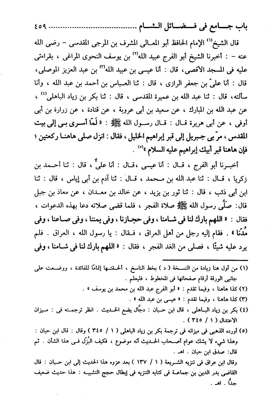 قال الشيخ الإمام الحافظ أبو المعالي المشرف بن المرجى المقدسي -رضي الله عنه-: أخبرنا الشيخ أبو الفرج عبيد الله بن يوسف النحوي المراغي، بقراءتي عليه في المسجد الأقصى، قال: أنا عيسى بن عبيد الله بن عبد العزيز الموصلي، قال: أنا علي بن جعفر الرازي، قال: ثنا العباس بن أحمد بن عبد الله، وأنا سألته، قال: ثنا عبد الله بن عميرة المقدسي، قال: ثنا بكر بن زياد الباهلي، عن عبد الله بن المبارك، عن سعيد بن أبي عروبة، عن قتادة، عن زرارة بن أبي أوفى، عن أبي هريرة قال: قال رسول الله صلى الله عليه وسلم: ((لما أسري بي إلى بيت المقدس، مر بي جبريل إلى قبر إبراهيم الخليل، فقال: انزل صلي هاهنا ركعتين؛ فإن هاهنا قبر أبيك إبراهيم عليه السلام)).