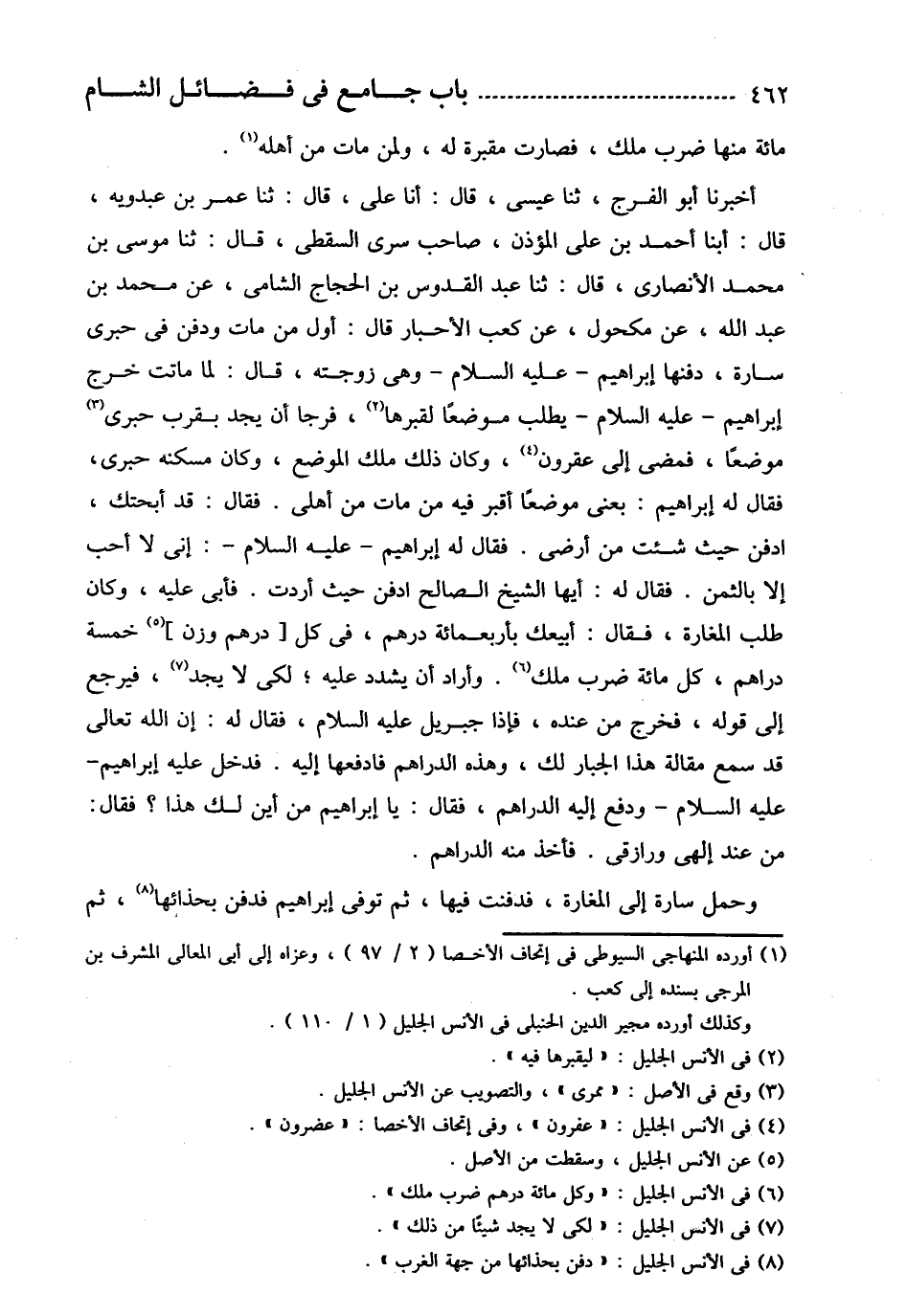 أخبرنا أبو الفرج، ثنا عيسى، قال: أنا علي، قال: ثنا عمر بن عبدويه، قال: أبنا أحمد بن علي المؤذن، صاحب سري السقطي، قال: ثنا موسى بن محمد الأنصاري، قال: ثنا عبد القدوس بن الحجاج الشامي، عن محمد بن عبد الله، عن مكحول، عن كعب الأحبار قال: أول من مات ودفن في حبرى سارة، دفنها إبراهيم –عليه السلام- وهي زوجته، قال: لما ماتت خرج إبراهيم -عليه السلام- يطلب موضعًا لقبرها، فرجا أن يجد بقرب حبرى موضعاً، فمضى إلى عقرون، وكان ذلك ملك الموضع، وكان مسكنه حبرى، فقال له إبراهيم: بعني موضعًا أقبر فيه من مات من أهلي. فقال: قد أبحتك، ادفن حيث شئت من أرضي. فقال له إبراهيم -عليه السلام-: إني لا أحب إلا بالثمن. فقال له: أيها الشيخ الصالح ادفن حيث أردت. فأبى عليه، وكان طلب المغارة، فقال: أبيعك بأربعمائة درهم، في كل [درهم وزن] خمسة دراهم، كل مائة ضرب ملك. وأراد أن يشدد عليه؛ لكي لا يجد، فيرجع إلى قوله، فخرج من عنده، فإذا جبريل عليه السلام، فقال له: إن الله تعالى قد سمع مقالة هذا الجبار لك، وهذه الدراهم فادفعها إليه. فدخل عليه إبراهيم -عليه السلام- ودفع إليه الدراهم، فقال: يا إبراهيم من أين لك هذا؟ فقال: من عند إلهي ورازقي. فأخذ منه الدراهم.
