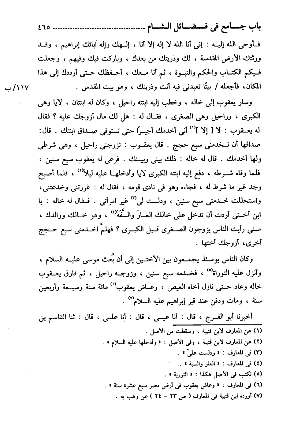 وكان الناس يومئذ يجمعون بين الأختين إلى أن بعث موسى عليه السلام، وأنزل عليه التوراة، فخدمه سبع سنين، وزوجه راحيل، ثم فارق يعقوب خاله وعاد حتى نازل أخاه العيص، وعاش يعقوب مائة سنة وسبعة وأربعين سنة، ومات ودفن عند قبر إبراهيم عليه السلام.