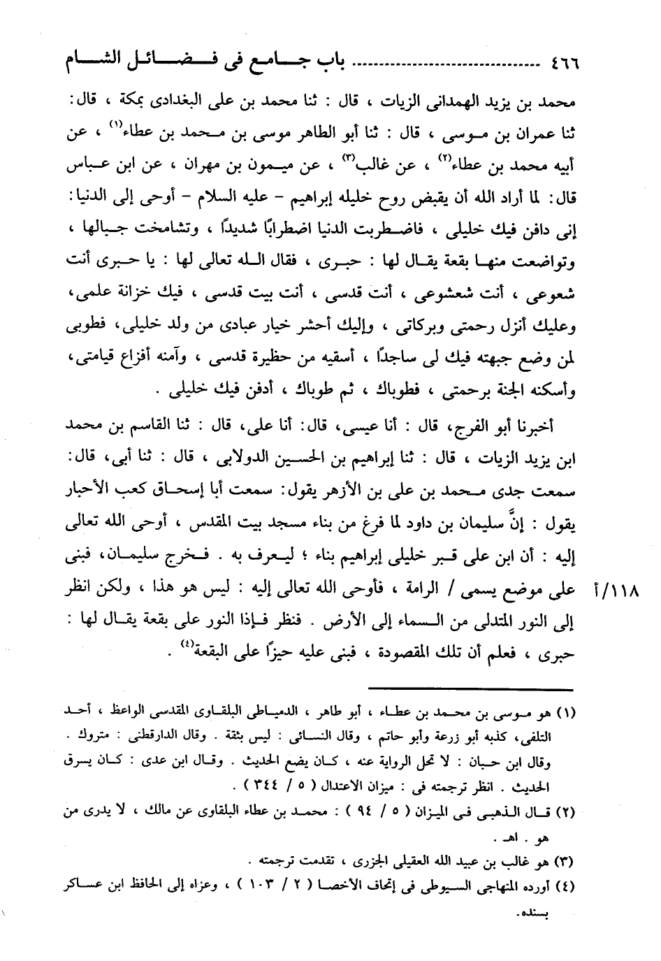 محمد بن يزيد الهمداني الزيات، قال: ثنا محمد بن علي البغدادي بمكة، قال: ثنا عمران بن موسى، قال: ثنا أبو الطاهر موسى بن محمد بن عطاء، عن أبيه محمد بن عطاء، عن غالب، عن ميمون بن مهران، عن ابن عباس قال: لما أراد الله أن يقبض روح خليله إبراهيم -عليه السلام- أوحى إلى الدنيا: إني دافن فيك خليلي، فاضطربت الدنيا اضطرابًا شديدًا، وتشامخت جبالها، وتواضعت منها بقعة يقال لها: حبرى، فقال الله تعالى لها: يا حبرى أنت شعوعي، أنت شعشوعي، أنت قدسي، أنت بيت قدسي، فيك خزانة علمي، وعليك أنزل رحمتي وبركاتي، وإليك أحشر خيار عبادي من ولد خليلي، فطوبى لمن وضع جبهته فيك لي ساجدًا، أسقيه من حظيرة قدسي، وآمنه أفزاع قيامتي، وأسكنه الجنة برحمتي، فطوباك، ثم طوباك، أدفن فيك خليلي.