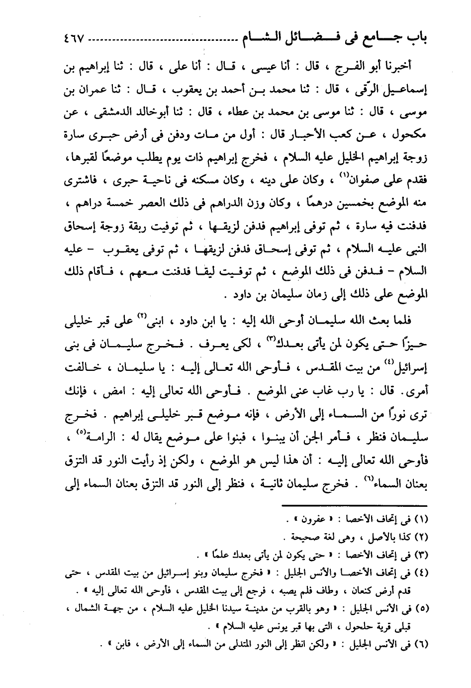 أخبرنا أبو الفرج، قال: أنا عيسى، قال: أنا علي، قال: ثنا إبراهيم بن إسماعيل الرقي، قال: ثنا محمد بن أحمد بن يعقوب، قال: ثنا عمران بن موسى، قال: ثنا موسى بن محمد بن عطاء، قال: ثنا أبو خالد الدمشقي، عن مكحول، عن كعب الأحبار قال: أول من مات ودفن في أرض حبرى سارة زوجة إبراهيم الخليل عليه السلام، فخرج إبراهيم ذات يوم يطلب موضعًا لقبرها، فقدم على صفوان، وكان على دينه، وكان مسكنه في ناحية حبرى، فاشترى منه الموضع بخمسين درهمًا، وكان وزن الدراهم في ذلك العصر خمسة دراهم، فدفنت فيه سارة، ثم توفي إبراهيم فدفن لزيقها، ثم توفيت ربقة زوجة إسحاق النبي عليه السلام، ثم توفي إسحاق فدفن لزيقها، ثم توفي يعقوب -عليه السلام- فدفن في ذلك الموضع، ثم توفيت ليقا فدفنت معهم، فأقام ذلك الموضع على ذلك إلى زمان سليمان بن داود.