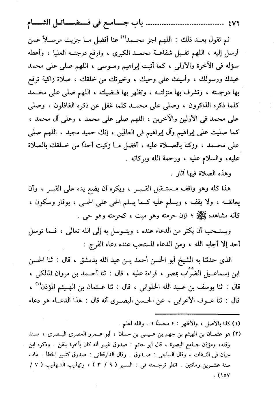 الذي حدثنا به الشيخ أبو الحسن أحمد بن عبد الله بدمشق، قال: ثنا الحسن ابن إسماعيل الضراب بمصر، قراءة عليه، قال: ثنا أحمد بن مروان المالكي، قال: ثنا يوسف بن عبد الله الحلواني، قال: ثنا عثمان بن الهيثم المؤذن، قال: ثنا عوف الأعرابي، عن الحسن البصري أنه قال: هذا الدعاء هو دعاء