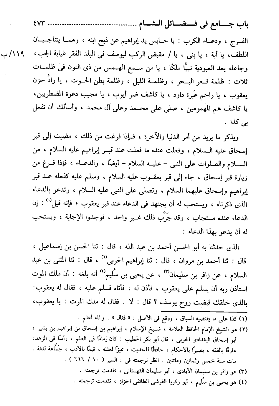 ويذكر ما يريد من أمر الدنيا والآخرة، فإذا فرغت من ذلك، مضيت إلى قبر إسحاق عليه السلام، وفعلت عنده ما فعلت عند قبر إبراهيم عليه السلام، من السلام والصلوات على النبي -عليه السلام- أيضًا، والدعاء، فإذا فرغ من زيارة قبر إسحاق، جاء إلى قبر يعقوب عليه السلام، وسلم عليه كفعله عند قبر إبراهيم وإسحاق عليهما السلام، وتصلي على النبي عليه السلام، وتدعو بالدعاء الذي ذكرناه، ويستحب له أن يجتهد في الدعاء عند قبر يعقوب؛ فإنه قيل: إن الدعاء عنده مستجاب، وقد جرب ذلك غير واحد، فوجدوا الإجابة، ويستحب له أن يدعو بهذا الدعاء: