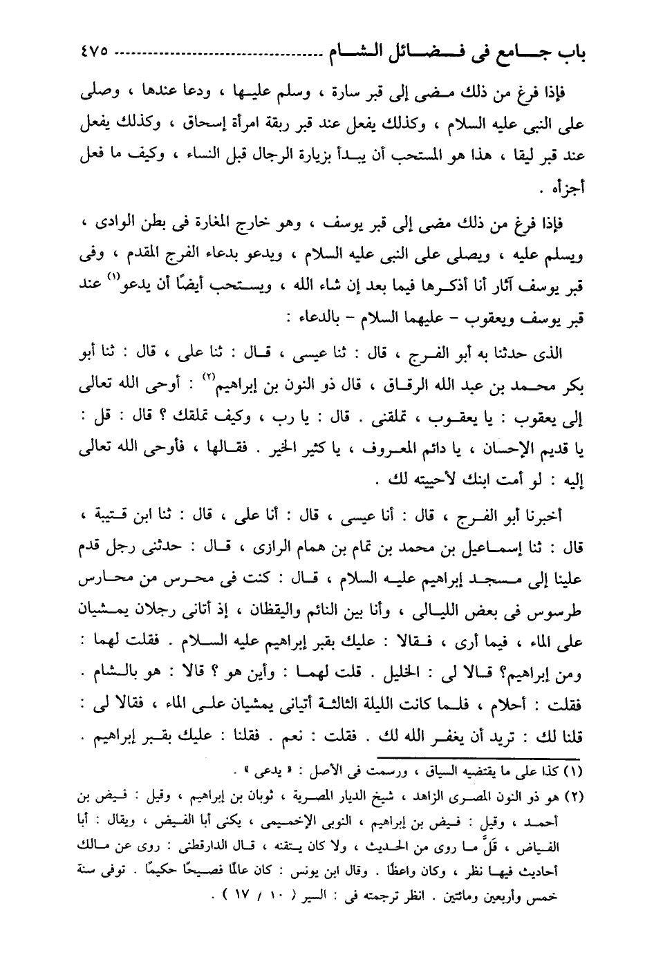 أخبرنا أبو الفرج، قال: أنا عيسى، قال: أنا علي، قال: ثنا ابن قتيبة، قال: ثنا إسماعيل بن محمد بن تمام بن همام الرازي، قال: حدثني رجل قدم علينا إلى مسجد إبراهيم عليه السلام، قال: كنت في محرس من محارس طرسوس في بعض الليالي، وأنا بين النائم واليقظان، إذ أتاني رجلان يمشيان على الماء، فيما أرى، فقالا: عليك بقبر إبراهيم عليه السلام. فقلت لهما: ومن إبراهيم؟ قالا لي: الخليل. قلت لهما: وأين هو؟ قالا: هو بالشام. فقلت: أحلام، فلما كانت الليلة الثالثة أتياني يمشيان على الماء، فقالا لي: قلنا لك: تريد أن يغفر الله لك. فقلت: نعم. فقلنا: عليك بقبر إبراهيم.