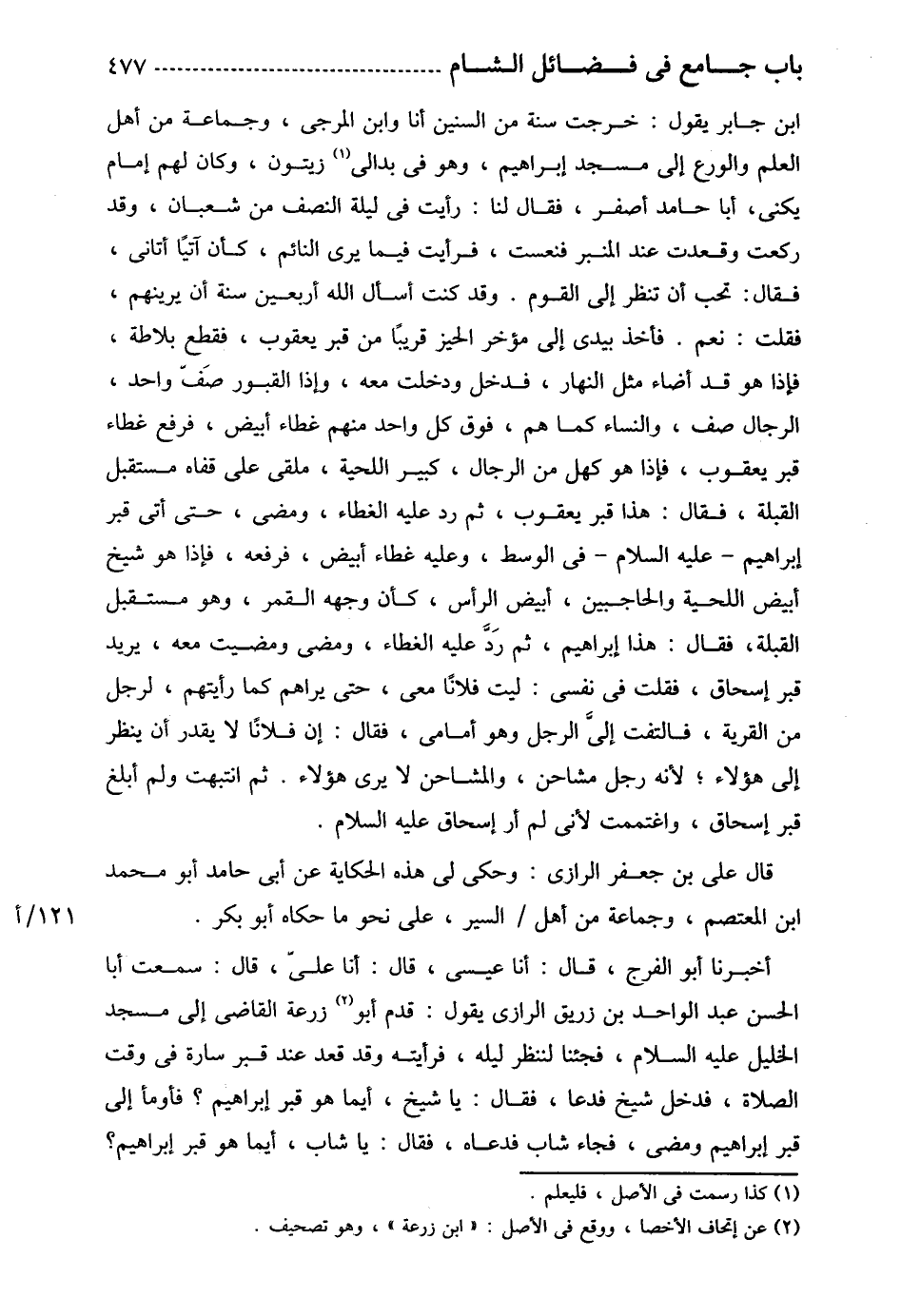 ابن جابر يقول: خرجت سنة من السنين أنا وابن المرجى، وجماعة من أهل العلم والورع إلى مسجد إبراهيم، وهو في بدالى زيتون، وكان لهم إمام يكنى، أبا حامد أصفر، فقال لنا: رأيت في ليلة النصف من شعبان، وقد ركعت وقعدت عند المنبر فنعست، فرأيت فيما يرى النائم، كأن آتيًا أتاني، فقال: تحب أن تنظر إلى القوم. وقد كنت أسأل الله أربعين سنة أن يرينهم، فقلت: نعم. فأخذ بيدي إلى مؤخر الحيز قريباً من قبر يعقوب، فقطع بلاطة، فإذا هو قد أضاء مثل النهار، فدخل ودخلت معه، وإذا القبور صف واحد، الرجال صف، والنساء كما هم، فوق كل واحد منهم غطاء أبيض، فرفع غطاء قبر يعقوب، فإذا هو كهل من الرجال، كبير اللحية، ملقى على قفاه مستقبل القبلة، فقال: هذا قبر يعقوب، ثم رد عليه الغطاء، ومضى، حتى أتى قبر إبراهيم -عليه السلام- في الوسط، وعليه غطاء أبيض، فرفعه، فإذا هو شيخ أبيض اللحية والحاجبين، أبيض الرأس، كأن وجهه القمر، وهو مستقبل القبلة، فقال: هذا إبراهيم، ثم رد عليه الغطاء، ومضى ومضيت معه، يريد قبر إسحاق، فقلت في نفسي: ليت فلانًا معي، حتى يراهم كما رأيتهم، لرجل من القرية، فالتفت إلي الرجل وهو أمامي، فقال: إن فلانًا لا يقدر أن ينظر إلى هؤلاء؛ لأنه رجل مشاحن، والمشاحن لا يرى هؤلاء. ثم انتبهت ولم أبلغ قبر إسحاق، واغتممت لأني لم أر إسحاق عليه السلام.