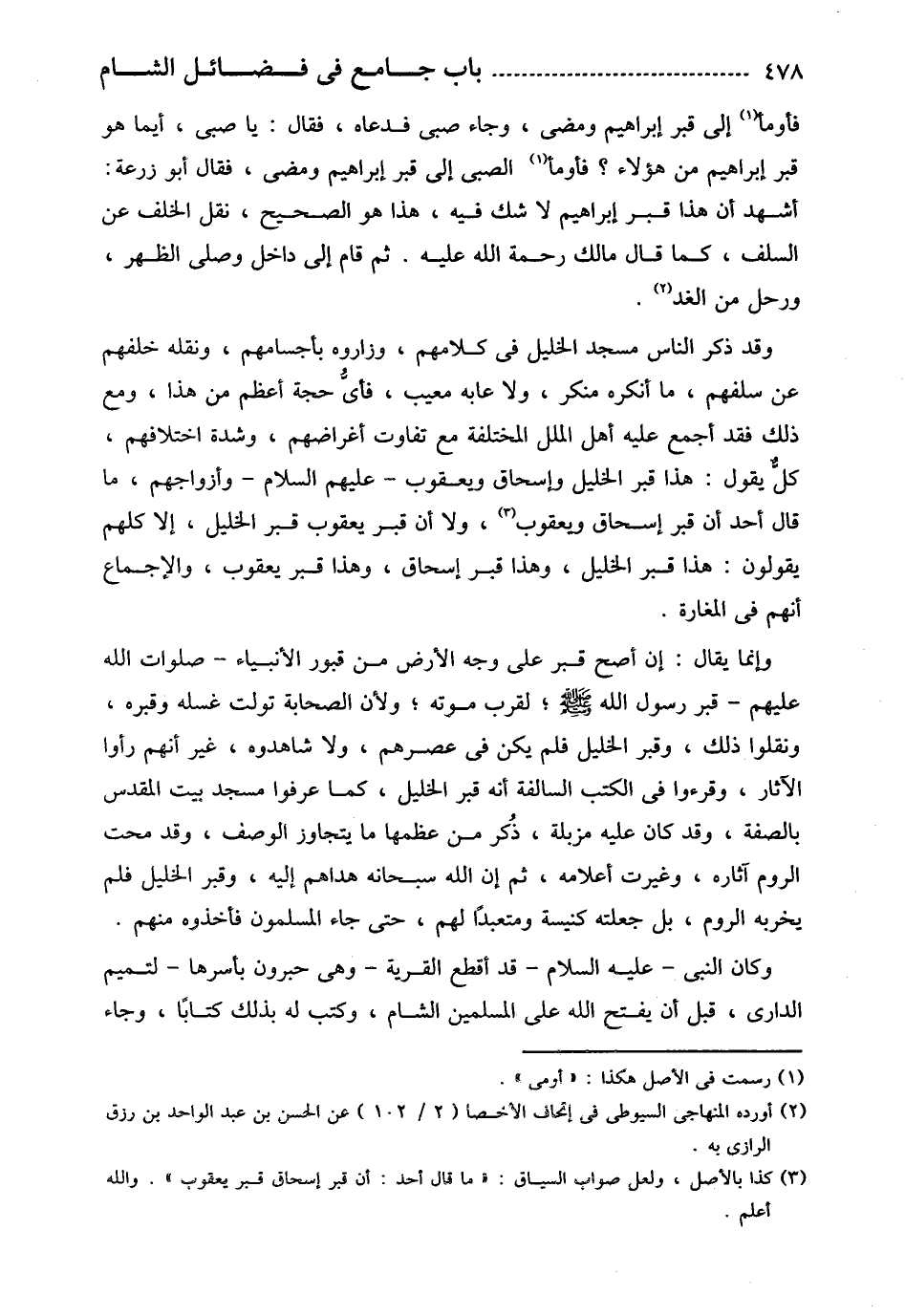 وقد ذكر الناس مسجد الخليل في كلامهم، وزاروه بأجسامهم، ونقله خلفهم عن سلفهم، ما أنكره منكر، ولا عابه معيب، فأي حجة أعظم من هذا، ومع ذلك فقد أجمع عليه أهل الملل المختلفة مع تفاوت أغراضهم، وشدة اختلافهم، كلٌّ يقول: هذا قبر الخليل وإسحاق ويعقوب -عليهم السلام- وأزواجهم، ما قال أحد أن قبر إسحاق ويعقوب، ولا أن قبر يعقوب قبر الخليل، إلا كلهم يقولون: هذا قبر الخليل، وهذا قبر إسحاق، وهذا قبر يعقوب، والإجماع أنهم في المغارة.