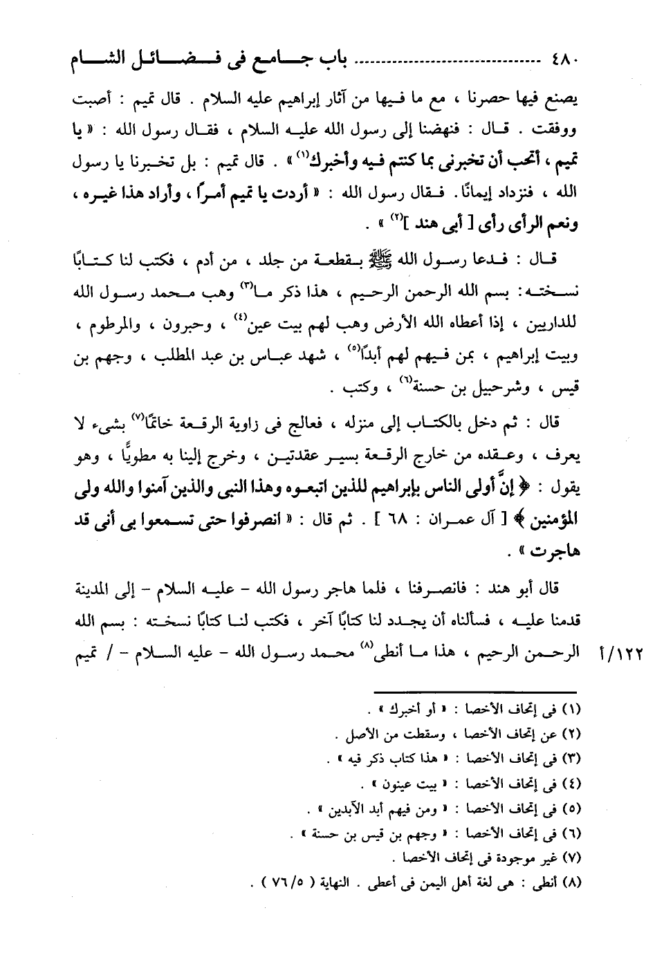قال: فدعا رسول الله صلى الله عليه وسلم بقطعة من جلد، من أدم، فكتب لنا كتابًا نسخته: بسم الله الرحمن الرحيم، هذا ذكر ما وهب محمد رسول الله للداريين، إذا أعطاه الله الأرض وهب لهم بيت عين، وحبرون، والمرطوم، وبيت إبراهيم، بمن فيهم لهم أبدًا، شهد عباس بن عبد المطلب، وجهم بن قيس، وشرحبيل بن حسنة، وكتب.