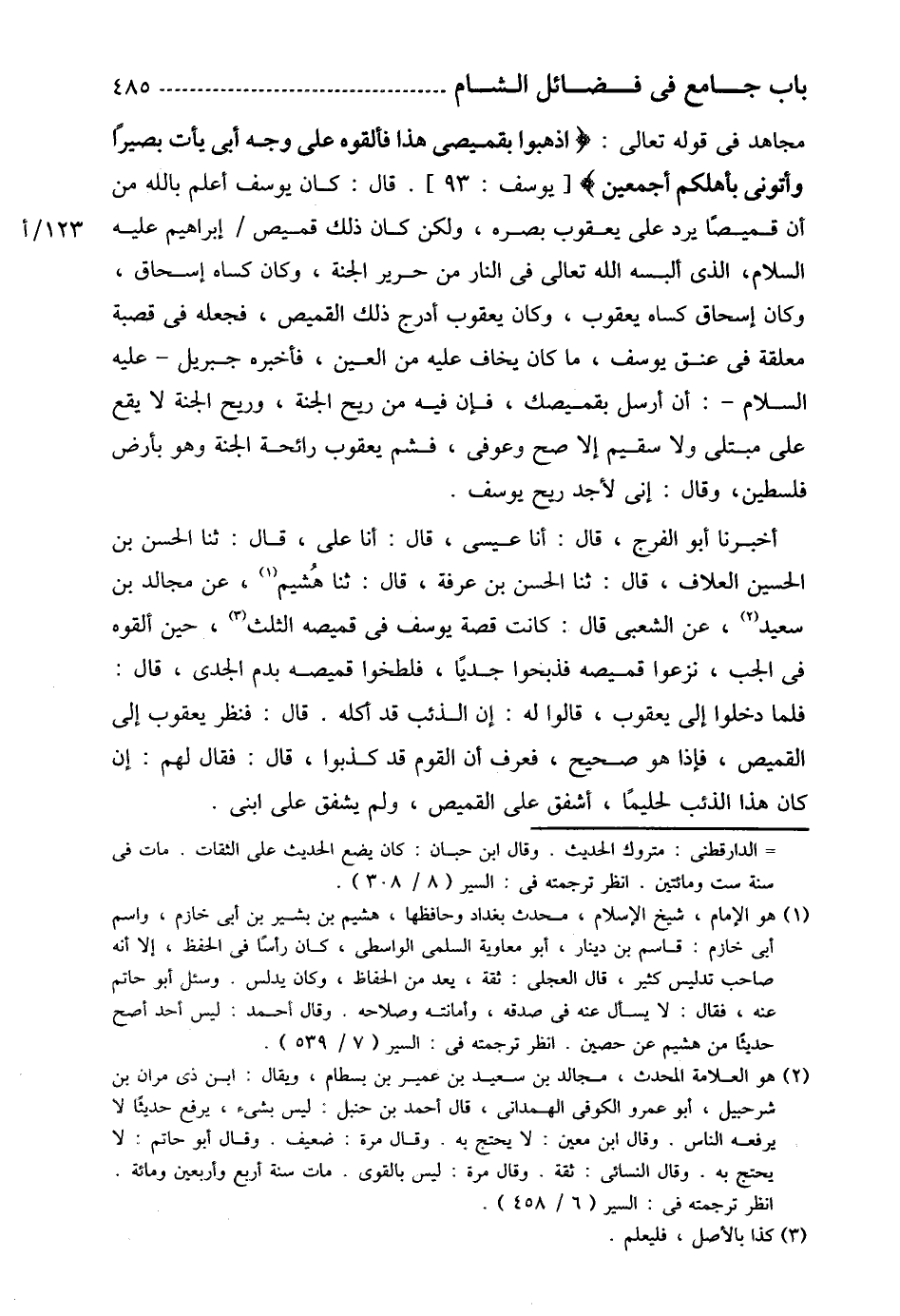 أخبرنا أبو الفرج، قال: أنا عيسى، قال: أنا علي، قال: ثنا الحسن بن الحسين العلاف، قال: ثنا الحسن بن عرفة، قال: ثنا هشيم، عن مجالد بن سعيد، عن الشعبي قال: كانت قصة يوسف في قميصه الثلث، حين ألقوه في الجب، نزعوا قميصه فذبحوا جديًا، فلطخوا قميصه بدم الجدي، قال: فلما دخلوا إلى يعقوب، قالوا له: إن الذئب قد أكله. قال: فنظر يعقوب إلى القميص، فإذا هو صحيح، فعرف أن القوم قد كذبوا، قال: فقال لهم: إن كان هذا الذئب لحليمًا، أشفق على القميص، ولم يشفق على ابني.