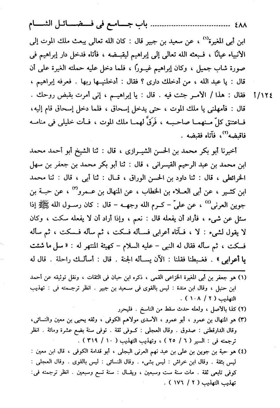 ابن أبي المغيرة، عن سعيد بن جبير قال: كان الله تعالى يبعث ملك الموت إلى الأنبياء عيانًا، فبعثه الله تعالى إلى إبراهيم ليقبضه، فأتاه فدخل دار إبراهيم في صورة شاب جميل، وكان إبراهيم غيورًا، فلما دخل عليه حملته الغيرة على أن قال: يا عبد الله، من أدخلك داري؟ فقال: أدخلنيها ربها. فعرفه إبراهيم، فقال: هذا الأمر جئت فيه. قال: يا إبراهيم، إني أمرت بقبض روحك. قال: فأمهلني يا ملك الموت، حتى يدخل إسحاق، فلما دخل إسحاق قام إليه، فاعتنق كل منهما صاحبه، فرق لهما ملك الموت، فأت خليلي في منامه فاقبضه، فآتاه فقبضه.