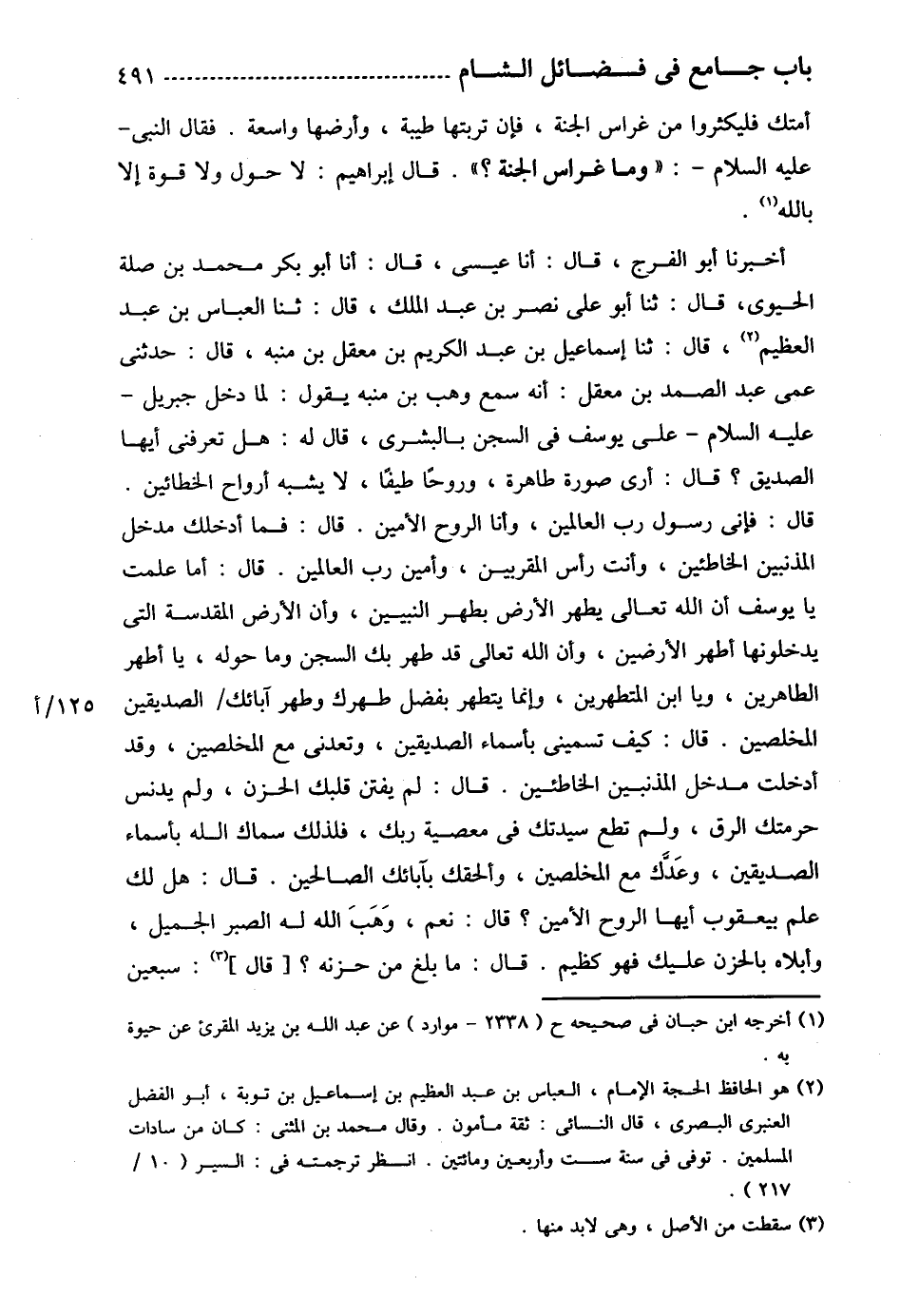 أخبرنا أبو الفرج، قال: أنا عيسى، قال: أنا أبو بكر محمد بن صلة الحيوي، قال: ثنا أبو علي نصر بن عبد الملك، قال: ثنا العباس بن عبد العظيم، قال: ثنا إسماعيل بن عبد الكريم بن معقل بن منبه، قال: حدثني عمي عبد الصمد بن معقل: أنه سمع وهب بن منبه يقول: لما دخل جبريل -عليه السلام- على يوسف في السجن بالبشرى، قال له: هل تعرفني أيها الصديق؟ قال: أرى صورة طاهرة، وروحًا طيفًا. لا يشبه أرواح الخطائين. قال: فإني رسول رب العالمين، وأنا الروح الأمين. قال: فما أدخلك مدخل المذنبين الخاطئين، وأنت رأس المقربين، وأمين رب العالمين. قال: أما علمت يا يوسف أن الله تعالى يطهر الأرض بطهر النبيين، وأن الأرض المقدسة التي يدخلونها أطهر الأرضين، وأن الله تعالى قد طهر بك السجن وما حوله، يا أطهر الطاهرين، ويا ابن المتطهرين، وإنما يتطهر بفضل طهرك وطهر آبائك الصديقين المخلصين. قال: كيف تسميني بأسماء الصديقين، وتعدني مع المخلصين، وقد أدخلت مدخل المذنبين الخاطئين. قال: لم يفتن قلبك الحزن، ولم يدنس حرمتك الرق، ولم تطع سيدتك في معصية ربك، فلذلك سماك الله بأسماء الصديقين، وعدك مع المخلصين، وألحقك بآبائك الصالحين. قال: هل لك علم بيعقوب أيها الروح الأمين؟ قال: نعم، وهب الله له الصبر الجميل، وأبلاه بالحزن عليك فهو كظيم. قال: ما بلغ من حزنه؟ [قال]: سبعين