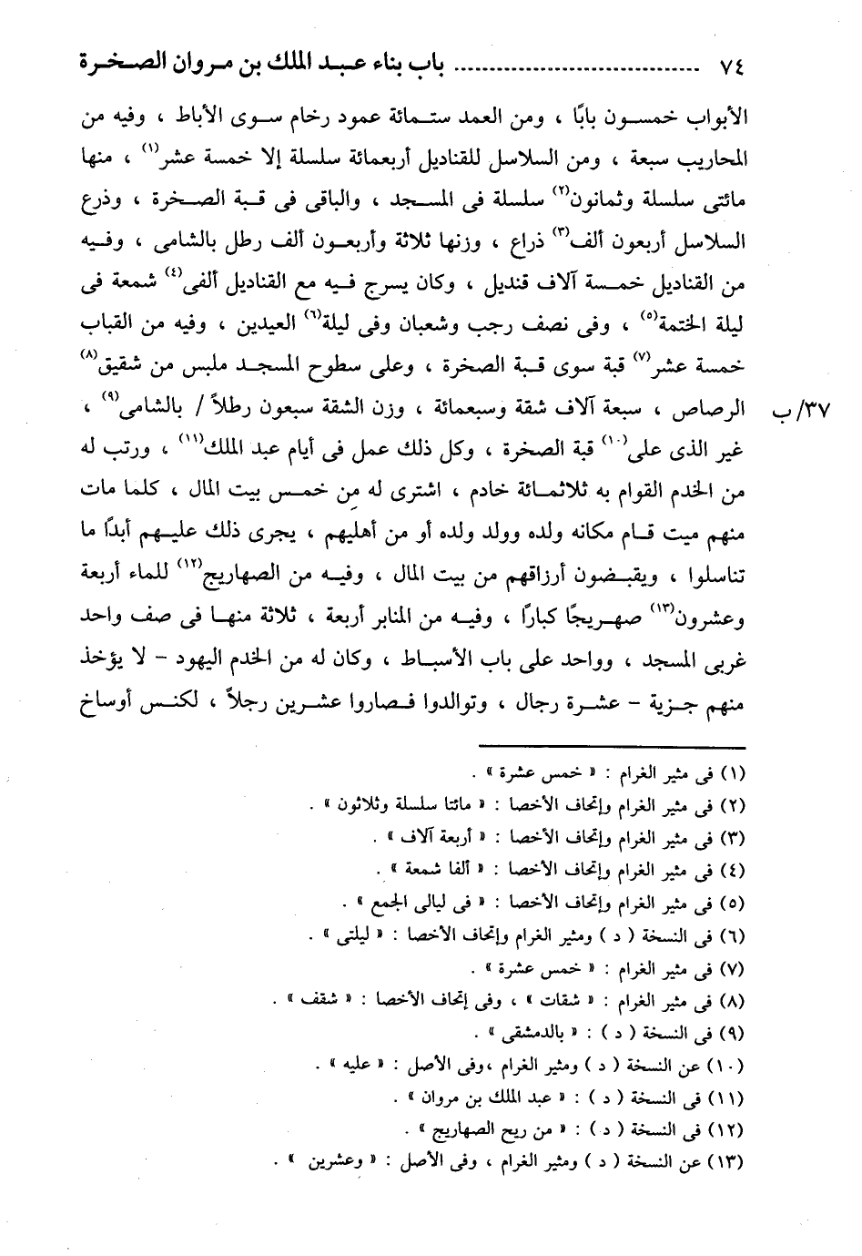 الأبواب خمسون بابًا، ومن العمد ستمائة عمود رخام سوى الأباط، وفيه من المحاريب سبعة، ومن السلاسل للقناديل أربعمائة سلسلة إلا خمسة عشر، منها مائتي سلسلة وثمانون سلسلة في المسجد، والباقي في قبة الصخرة، وذرع السلاسل أربعون ألف ذراع، وزنها ثلاثة وأربعون ألف رطل بالشامي، وفيه من القناديل خمسة آلاف قنديل، وكان يسرج فيه مع القناديل ألفى شمعة في ليلة الختمة، وفي نصف رجب وشعبان وفي ليلة العيدين، وفيه من القباب خمسة عشر قبة سوى قبة الصخرة، وعلى سطوح المسجد ملبس من شقيق الرصاص، سبعة آلاف شقة وسبعمائة، وزن الشقة سبعون رطلاً بالشامي، غير الذي على قبة الصخرة، وكل ذلك عمل في أيام عبد الملك، ورتب له من الخدم القوام به ثلاثمائة خادم، اشترى له من خمس بيت المال، كلما مات منهم ميت قام مكانه ولده وولد ولده أو من أهليهم، يجري ذلك عليهم أبدًا ما تناسلوا، ويقبضون أرزاقهم من بيت المال، وفيه من الصهاريج للماء أربعة وعشرون صهريجًا كبارًا، وفيه من المنابر أربعة، ثلاثة منها في صف واحد غربي المسجد، وواحد على باب الأسباط، وكان له من الخدم اليهود -لا يؤخذ منهم جزية- عشرة رجال، وتوالدوا فصاروا عشرين رجلاً، لكنس أوساخ