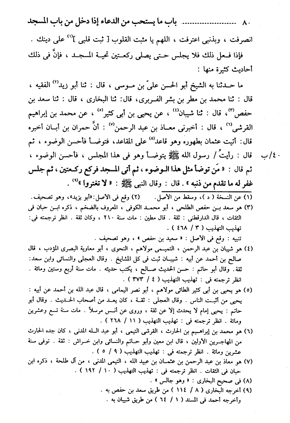 ما حدثنا به الشيخ أبو الحسن علي بن موسى، قال: ثنا أبو زيد الفقيه، قال: ثنا محمد بن مطر بن بشر الفربري، قال: ثنا البخاري، قال: ثنا سعد بن حفص، قال: ثنا شيبان، عن يحيى بن أبي كثير، عن محمد بن إبراهيم القرشي، قال: أخبرني معاذ بن عبد الرحمن: أن حمران بن أبان أخبره قال: أتيت عثمان بطهوره وهو قاعد على المقاعد، فتوضأ فأحسن الوضوء، ثم قال: رأيت رسول الله صلى الله عليه وسلم يتوضأ وهو في هذا المجلس، فأحسن الوضوء، ثم قال: ((من توضأ مثل هذا الوضوء، ثم أتى المسجد فركع ركعتين، ثم جلس غفر له ما تقدم من ذنبه)). قال: وقال النبي صلى الله عليه وسلم: ((لا تغتروا)).