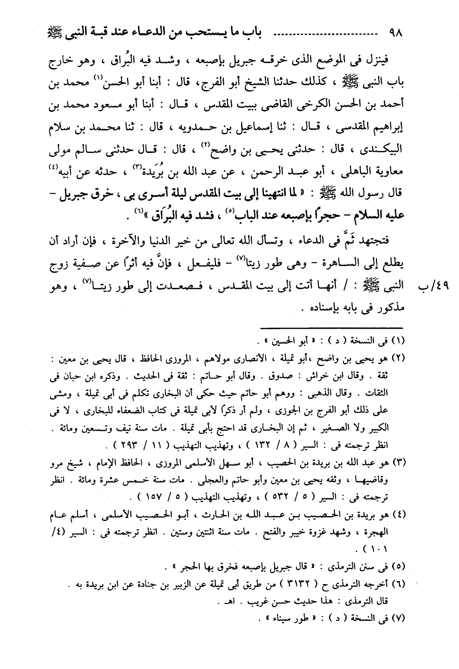 فينزل في الموضع الذي خرقه جبريل بإصبعه، وشد فيه البراق، وهو خارج باب النبي صلى الله عليه وسلم، كذلك حدثنا الشيخ أبو الفرج، قال: أبنا أبو الحسن محمد بن أحمد بن الحسن الكرخي القاضي ببيت المقدس، قال: أبنا أبو مسعود محمد بن إبراهيم المقدسي، قال: ثنا إسماعيل بن حمدويه، قال: ثنا محمد بن سلام البيكندي، قال: حدثني يحيى بن واضح، قال: قال حدثني سالم مولى معاوية الباهلي، أبو عبد الرحمن، عن عبد الله بن بريدة، حدثه عن أبيه قال رسول الله صلى الله عليه وسلم: ((لما انتهينا إلى بيت المقدس ليلة أسرى به، خرق جبريل -عليه السلام- حجرًا بإصبعه عند الباب، فشد فيه البراق)).