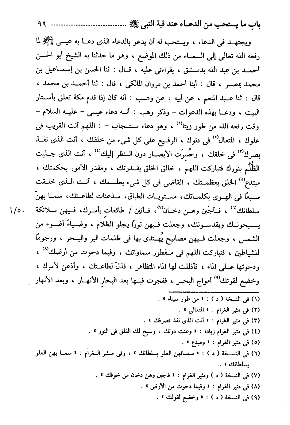 ويجتهد في الدعاء، ويستحب له أن يدعو بالدعاء الذي دعا به عيسى صلى الله عليه وسلم لما رفعه الله تعالى إلى السماء من ذلك الموضع، وهو ما حدثنا به الشيخ أبو الحسن أحمد بن عبد الله بدمشق، بقراءتي عليه، قال: ثنا الحسن بن إسماعيل بن محمد بمصر، قال: أبنا أحمد بن مروان المالكي، قال: ثنا أحمد بن محمد، قال: ثنا عبد المنعم، عن أبيه، عن وهب: أنه كان إذا قدم مكة تعلق بأستار البيت، ودعا بهذه الدعوات -وذكر وهب: أنه دعاء عيسى -عليه السلام- وقت رفعه الله من طور زيتا، وهو دعاء مستجاب-: اللهم أنت القريب في علوك، المتعال في دنوك، الرفيع على كل شيء من خلقك، أنت الذي نفذ بصرك في خلقك، وحسرت الأبصار دون النظر إليك، أنت الذي جليت الظلم بنورك فتباركت اللهم، خالق الخلق بقدرتك، ومقدر الأمور بحكمتك، مبتدع الخلق بعظمتك، القاضي في كل شيء بعلمك، أنت الذي خلقت سبعًا في الهوى بكلماتك، مستويات الطباق، مذعنات لطاعتك، سما بهن سلطانك، فأجبن وهن دخان، فأتين طائعاتٍ بأمرك، فيهن ملائكة يسبحونك ويقدسونك، وجعلت فيهن نورًا يجلو الظلام، وضياءً أضوء من الشمس، وجعلت فيهن مصابيح يهتدى بها في ظلمات البر والبحر، ورجومًا للشياطين، فتباركت اللهم في مفطور سماواتك، وفيما دحوت من أرضك، ودحوتها على الماء، فأذللت لها الماء المتظاهر، فذل لطاعتك، وأذعن لأمرك، وخضع لقوتك أمواج البحر، ففجرت فيها بعد البحار الأنهار، وبعد الأنهار