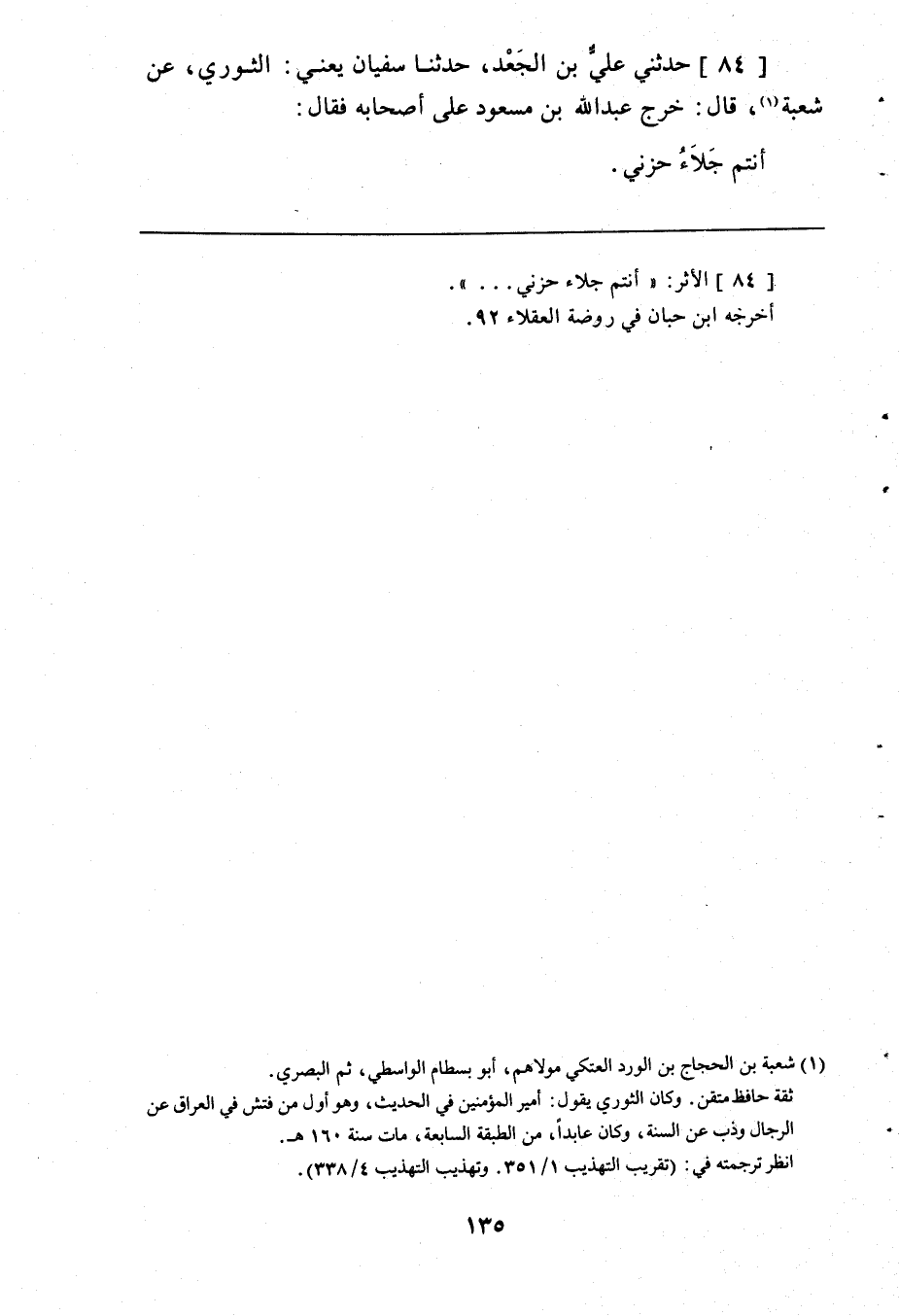 84 - حَدَّثَنِي عَلِيُّ بْنُ الْجَعْدِ، حَدَّثَنَا سُفْيَانُ يَعْنِي الثَّوْرِيَّ، عَنْ شُعْبَةَ، قَالَ: " خَرَجَ عَبْدُ اللَّهِ بْنُ مَسْعُودٍ عَلَى أَصْحَابِهِ فَقَالَ: §أَنْتُمْ جَلَاءُ حُزْنِي "
