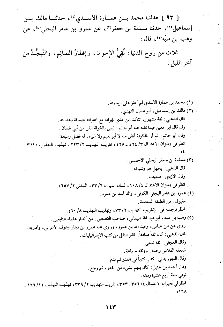 93 - حَدَّثَنَا مُحَمَّدُ بْنُ عُمَارَةَ الْأَسَدِيُّ، حَدَّثَنَا مَالِكُ بْنُ إِسْمَاعِيلَ، حَدَّثَنَا مَسْلَمَةُ بْنُ جَعْفَرٍ، عَنْ عَمْرِو بْنِ عَامِرٍ الْبَجَلِيِّ، عَنْ وَهْبِ بْنِ مُنَبِّهٍ، قَالَ: «§ثَلَاثٌ مِنْ رَوْحِ الدُّنْيَا لُقِيُّ الْإِخْوَانِ وَإِفْطَارُ الصَّائِمِ وَالتَّهَجُّدُ مِنْ آخِرِ اللَّيْلِ»