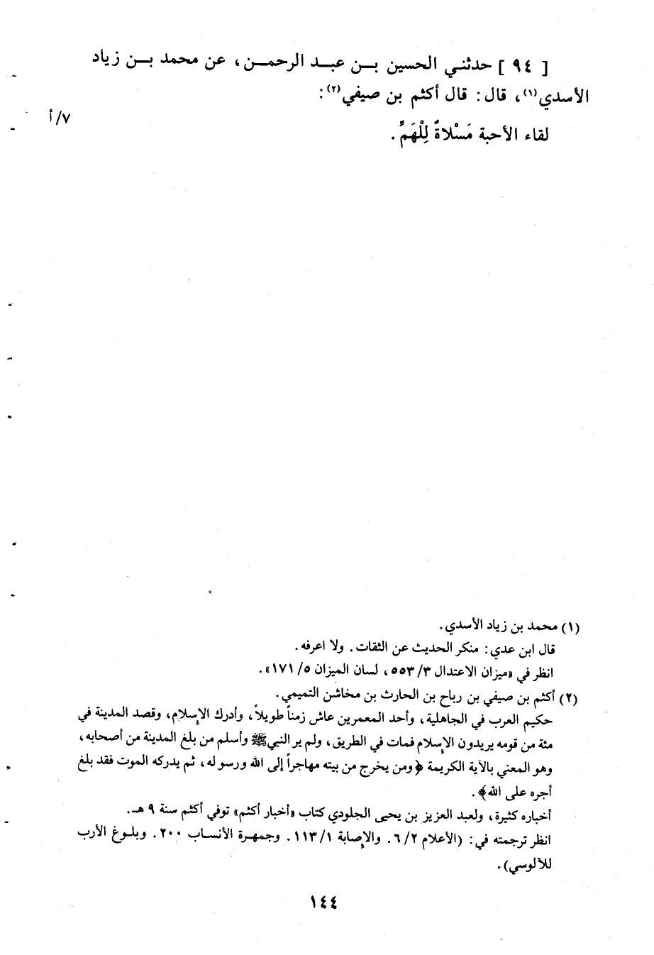 94 - حَدَّثَنِي الْحُسَيْنُ بْنُ عَبْدِ الرَّحْمَنِ، عَنْ مُحَمَّدِ بْنِ زِيَادٍ الْأَسَدِيِّ، قَالَ: قَالَ أَكْثَمُ بْنُ صَيْفِيٍّ: «§لِقَاءُ الْأَحِبَّةِ مَسْلَاةٌ لِلْهَمِّ»