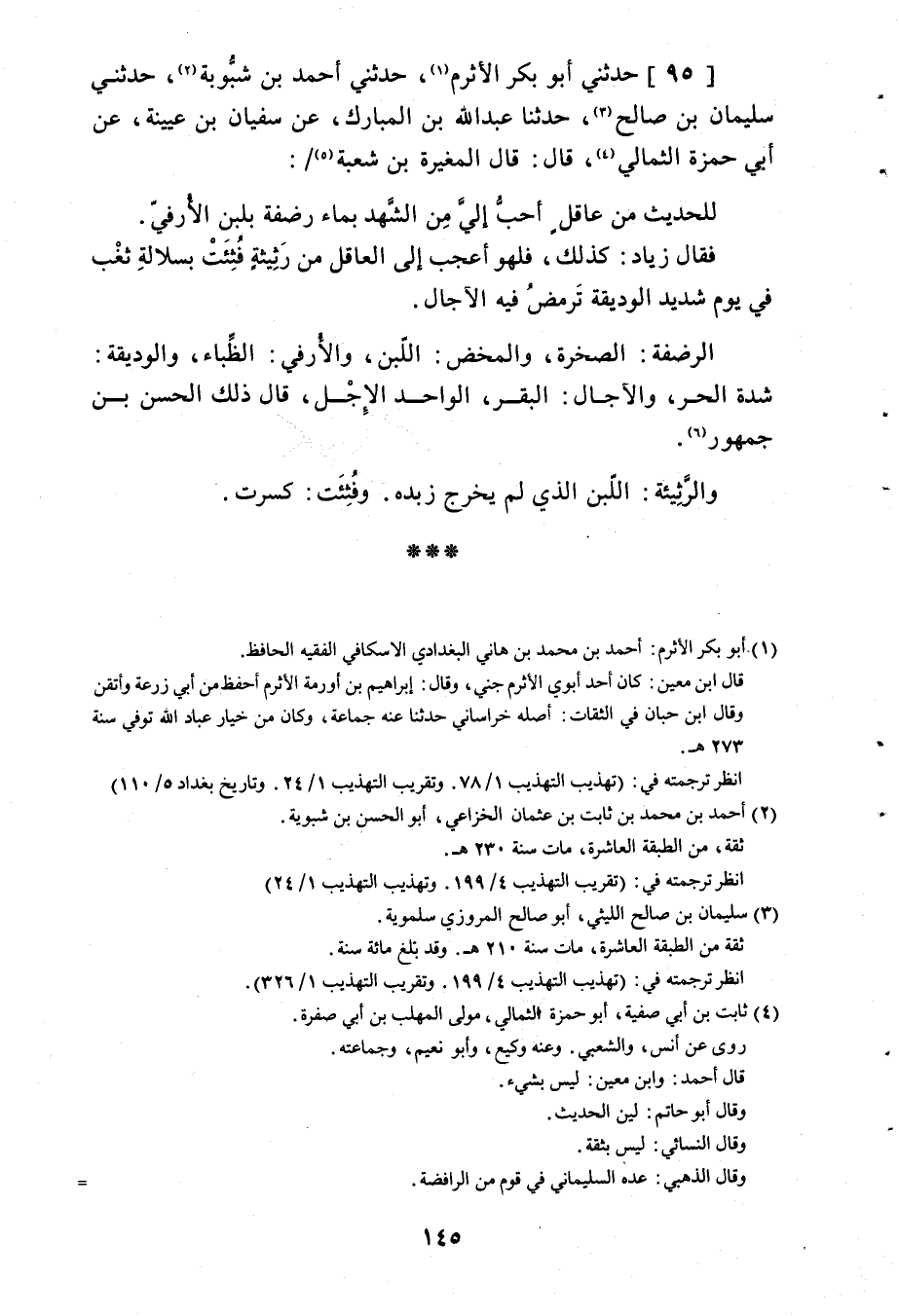 95 - حَدَّثَنِي أَبُو بَكْرٍ الْأَثْرَمُ، حَدَّثَنِي أَحْمَدُ بْنُ شَبُّويَةَ، حَدَّثَنِي سُلَيْمَانُ بْنُ صَالِحٍ، حَدَّثَنَا عَبْدُ اللَّهِ بْنُ الْمُبَارَكِ، عَنْ سُفْيَانَ بْنِ عُيَيْنَةَ، عَنْ أَبِي حَمْزَةَ الثُّمَالِيِّ، قَالَ: قَالَ الْمُغِيرَةُ بْنُ شُعْبَةَ: «§لَلْحَدِيثُ مِنْ عَاقِلٍ أَحَبُّ إِلَيَّ مِنَ الشُّهْدِ بِمَاءِ رَصْفَةٍ بِمَحْضِ الْأُرُفَّى» فَقَالَ زِيَادٌ كَذَلِكَ: فَلَهُوَ أَعْجَبُ إِلَى الْعَاقِلِ مِنْ رَثِيئَةٍ فُثِئَتْ بِسُلَالَةِ ثَغْبٍ فِي يَوْمٍ شَدِيدِ الْوَدِيقَةِ تَرْمَضُ فِيهِ الْآجَالُ. " الرَّصْفَةُ: الصَّخْرَةُ، وَالْمَحْضُ: اللَّبَنُ، وَالْأُرُفَّى: الظِّبَاءُ، وَالْوَدِيقَةُ: شِدَّةُ الْحَرِّ، وَالْآجَالُ: الْبَقَرُ الْوَاحِدُ الْإِجْلُ، قَالَ ذَلِكَ الْحَسَنُ بْنُ جُمْهُورٍ، وَالرَّثِيئَةُ: اللَّبَنُ الَّذِي لَمْ يُخْرَجْ زُبْدُهُ، وَفُثِئَتْ: كُسِرَتْ "