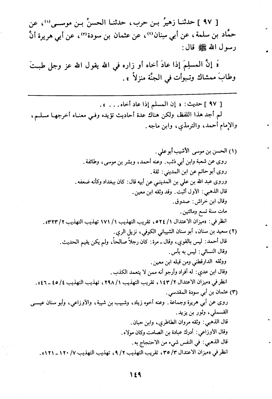 97 - حَدَّثَنَا زُهَيْرُ بْنُ حَرْبٍ، حَدَّثَنَا الْحَسَنُ بْنُ مُوسَى، عَنْ حَمَّادِ بْنِ سَلَمَةَ، عَنْ أَبِي سِنَانٍ، عَنْ عُثْمَانَ بْنِ سَوْدَةَ، عَنْ أَبِي هُرَيْرَةَ، أَنَّ رَسُولَ اللَّهِ صَلَّى اللهُ عَلَيْهِ وَسَلَّمَ قَالَ: " إِنَّ §الْمُسْلِمَ إِذَا عَادَ أَخَاهُ أَوْ زَارَهُ فِي اللَّهِ يَقُولُ اللَّهُ عَزَّ وَجَلَّ: طِبْتَ وَطَابَ مَمْشَاكَ وَتَبَوَّأْتَ فِي الْجَنَّةِ مَنْزِلًا "